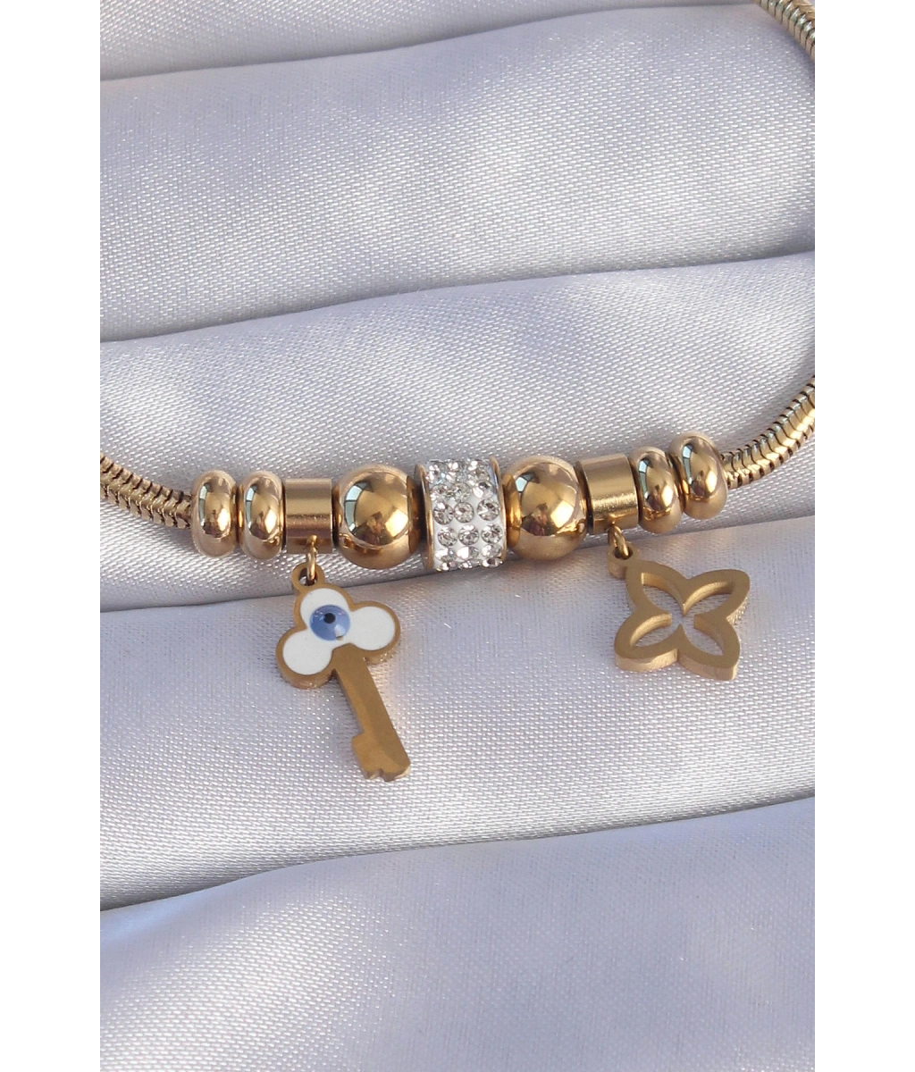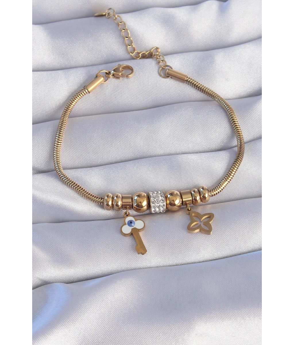 Shoecide 316l Çelik Gold Renk Zirkon Taşlı Yonca Detay Nazarlı Anahtar Tasarımlı Bileklik