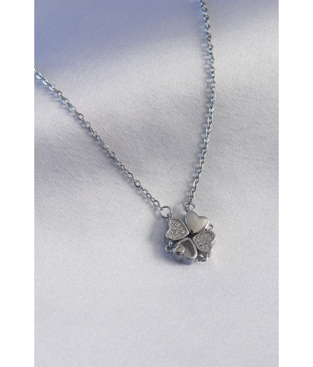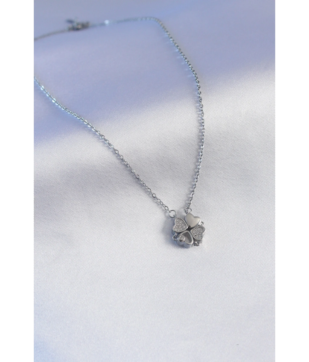 Shoecide 316l Çelik Gümüş Renk Açılır Zirkon Taşlı Yonca Model Kadın Kolye