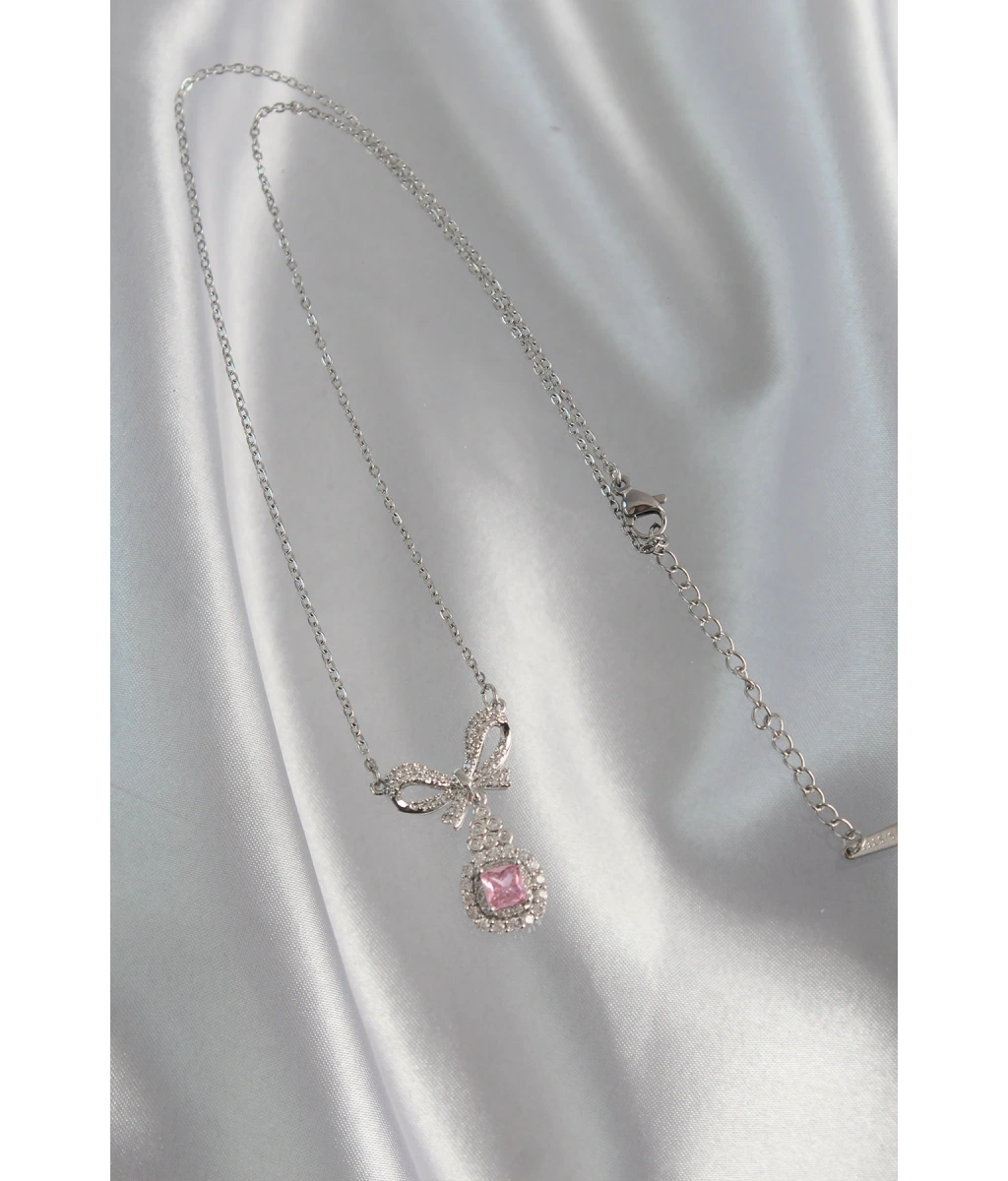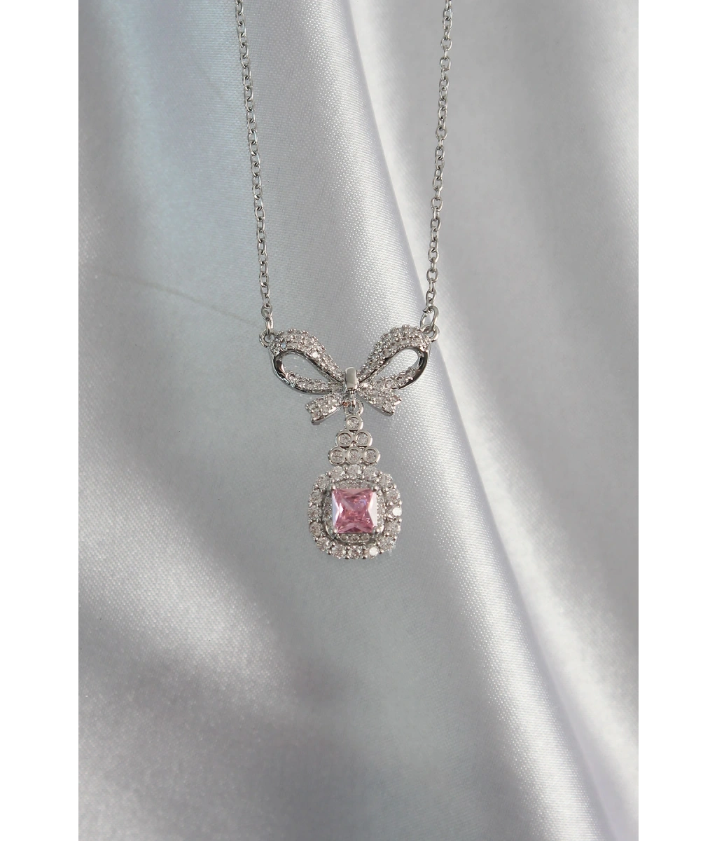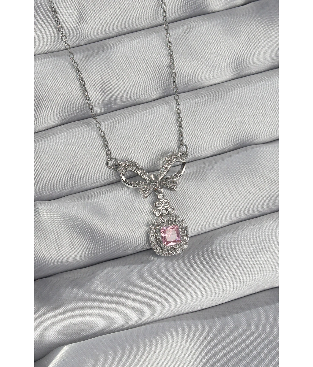 Shoecide 316l Çelik Gümüş Renk Fiyonk Detay Pembe Zirkon Taşlı Tektaş Kolye