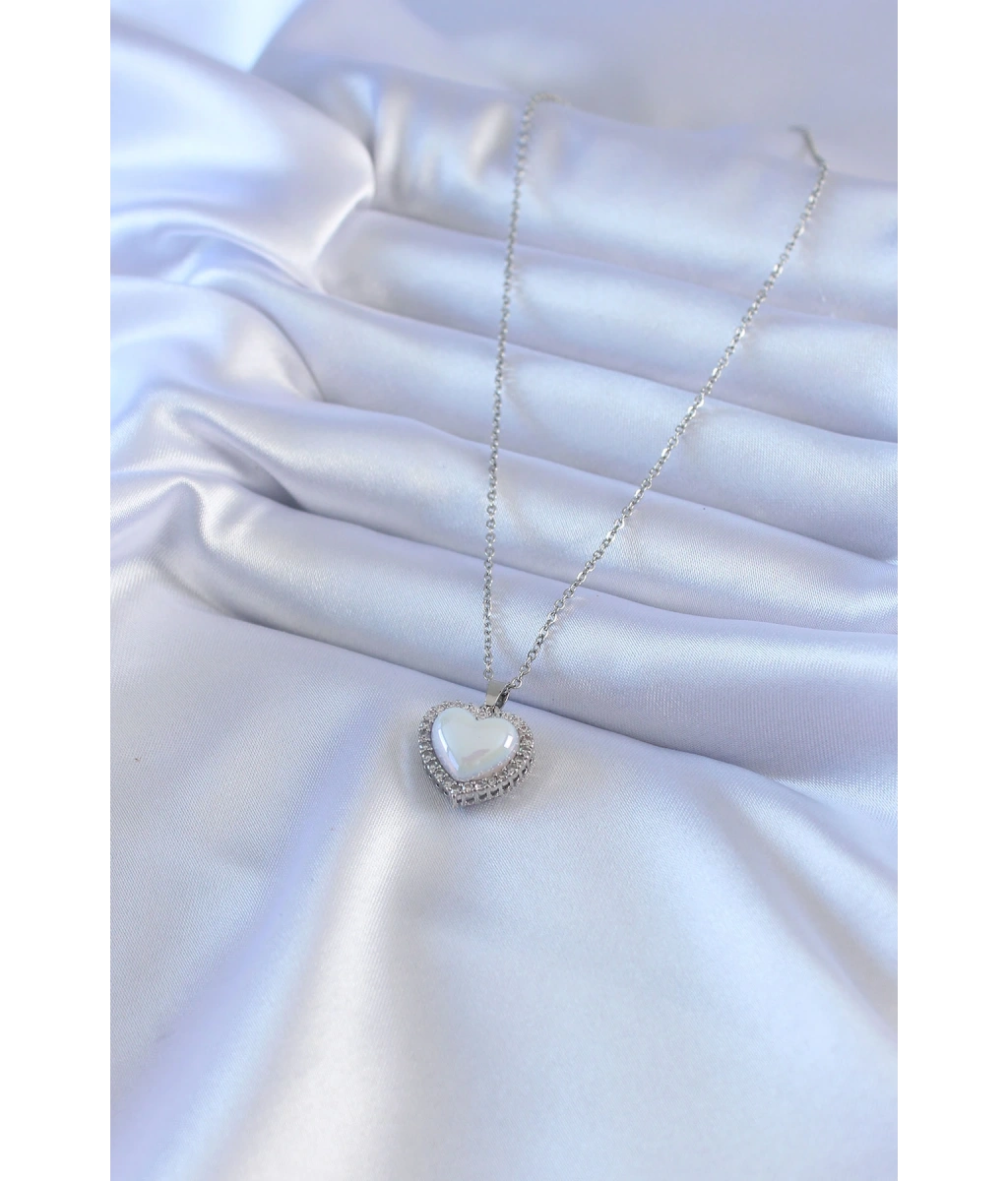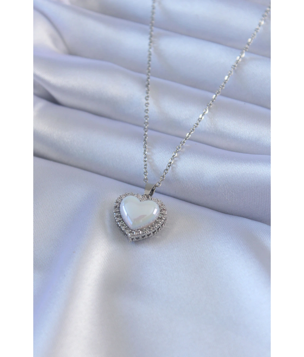 Shoecide 316l Çelik Gümüş Renk İncili Kalp Model Zirkon Taşlı Kadın Kolye