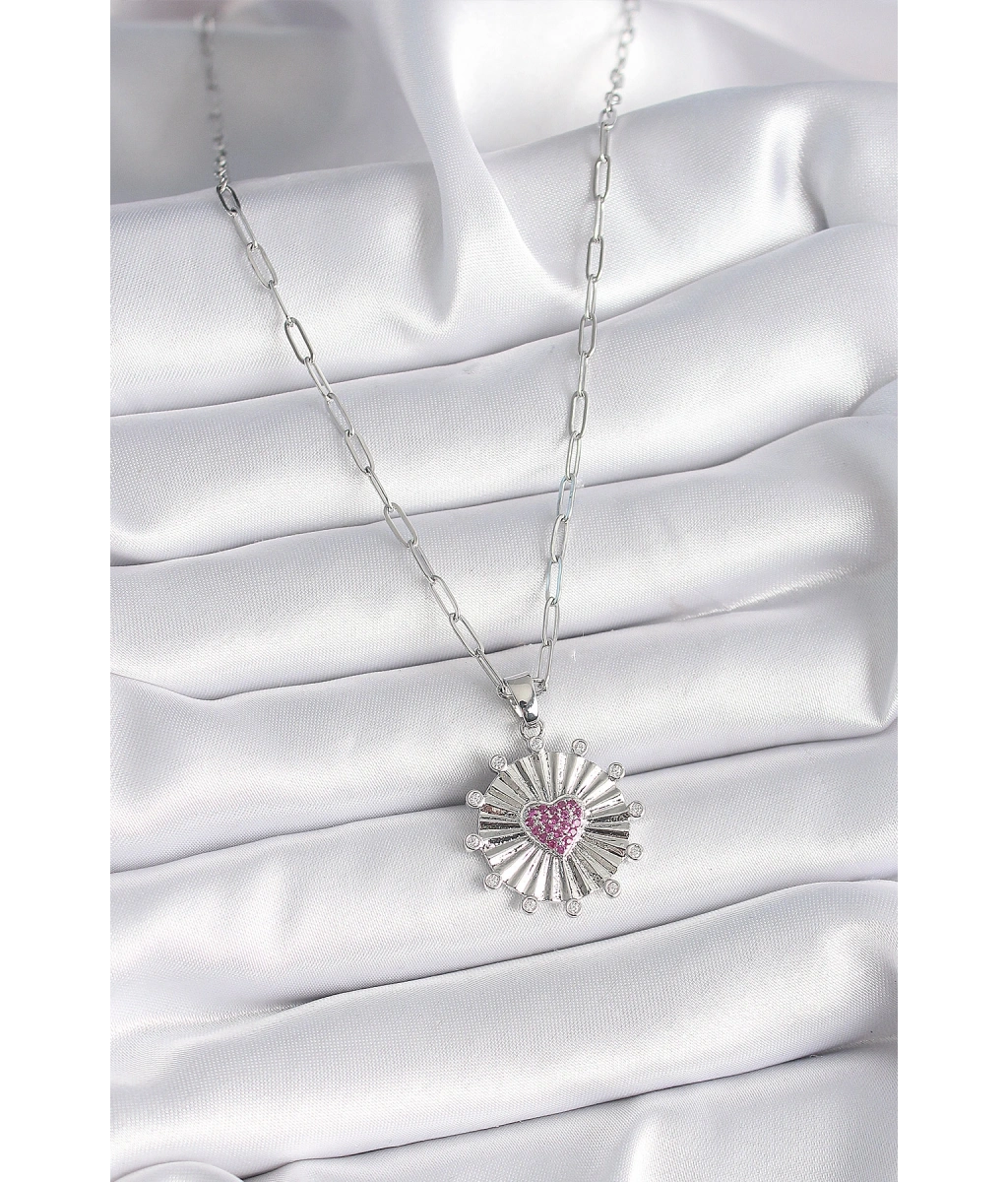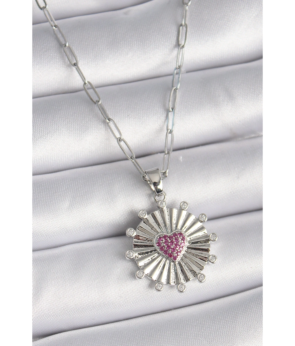 Shoecide 316l Çelik Gümüş Renk Pembe Zirkon Taşlı Kalp İşleme Madalyon Model Kadın Kolye
