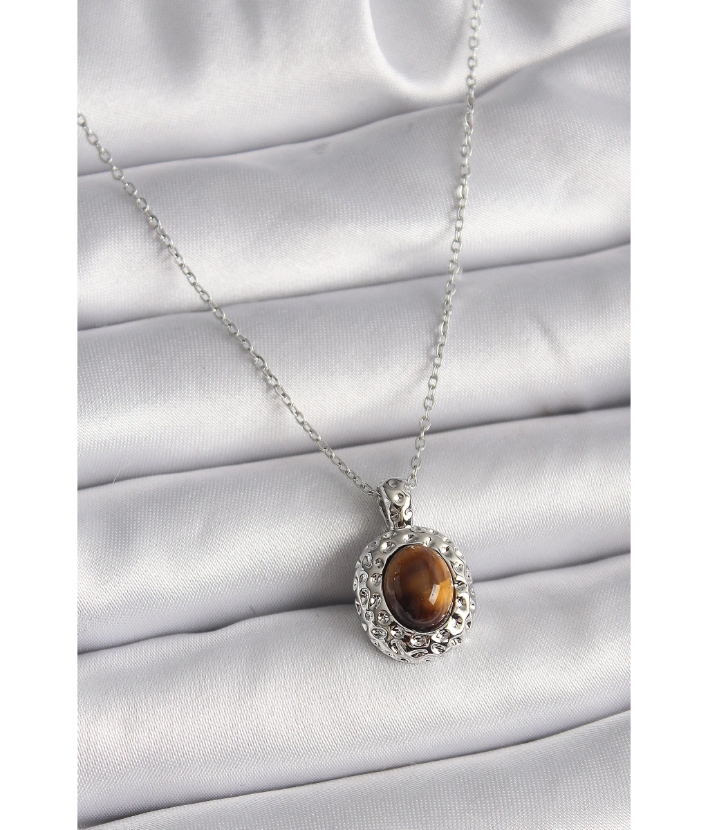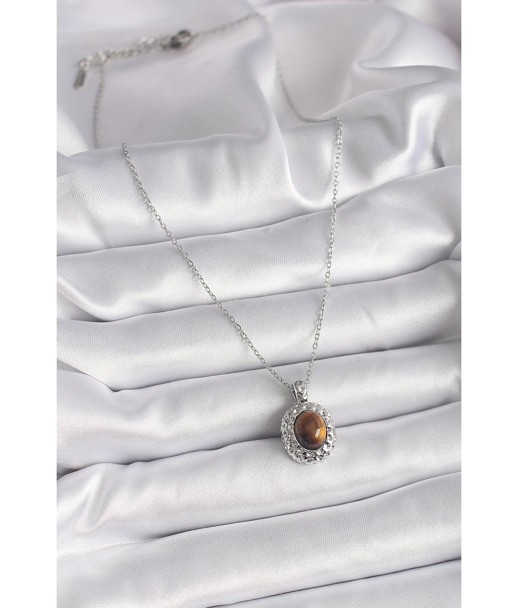 Shoecide 316l Çelik Gümüş Renk Zincir Kehribar Boncuk Model Kadın Kolye