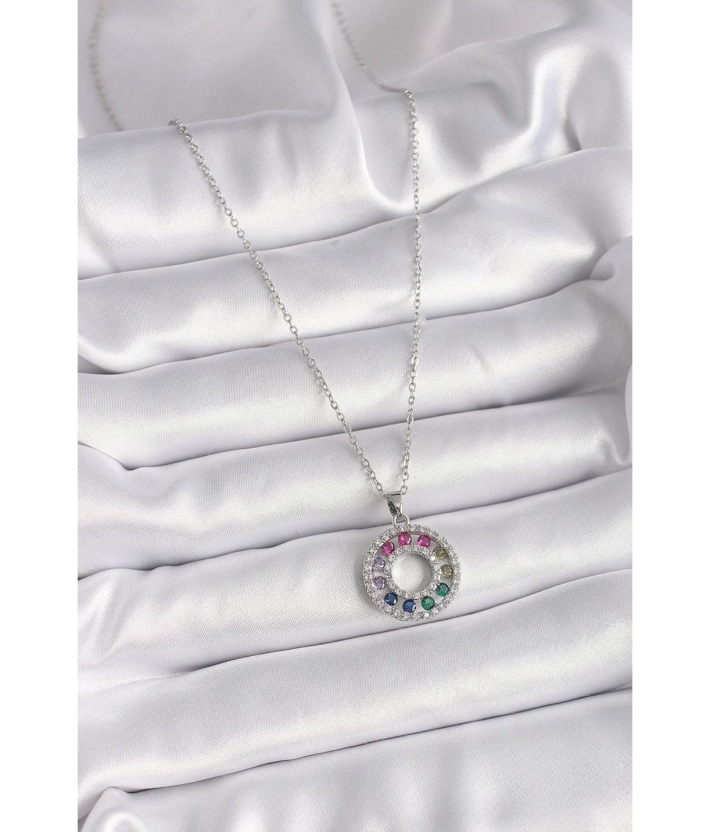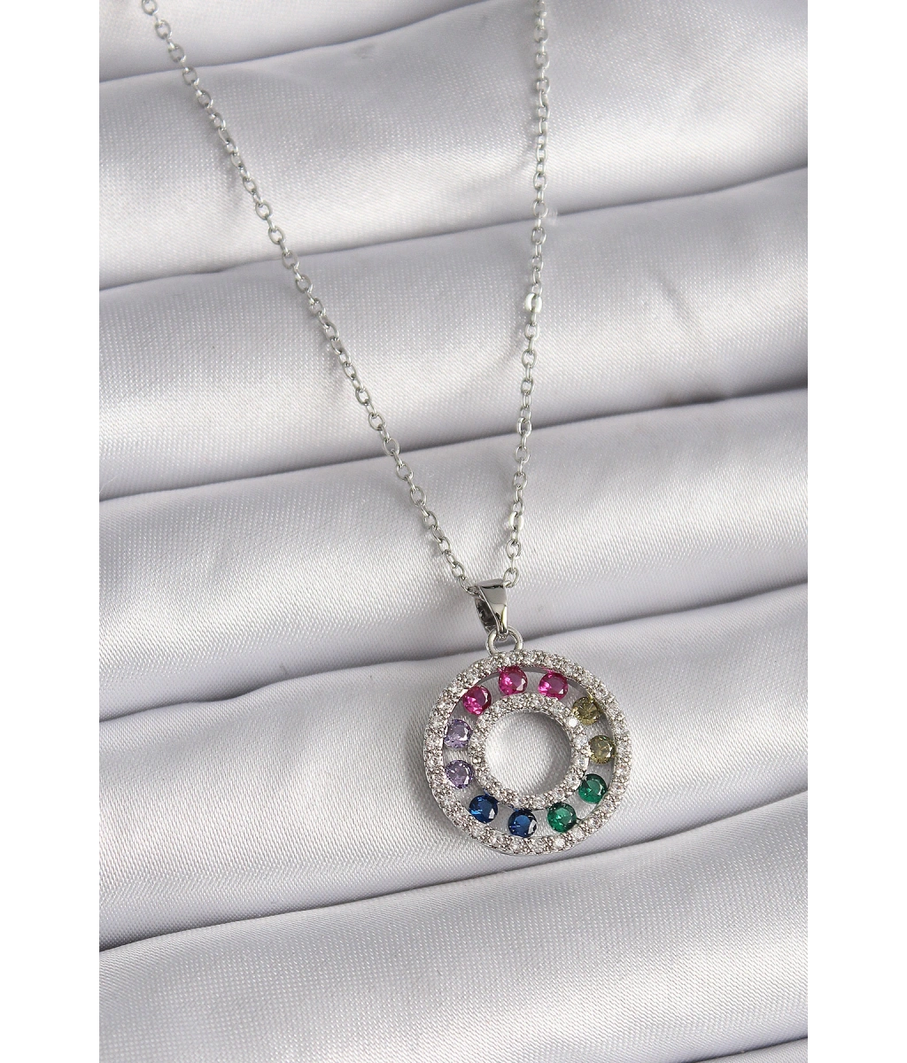 Shoecide 316l Çelik Gümüş Renk Zincir Renkli Zirkon Taşlı Madalyon Model Kadın Kolye