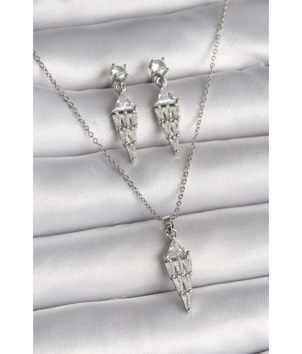 Shoecide 316l Çelik Gümüş Renk Zincir Sallantı Zirkon Taş Model Kadın Kolye Küpe Seti