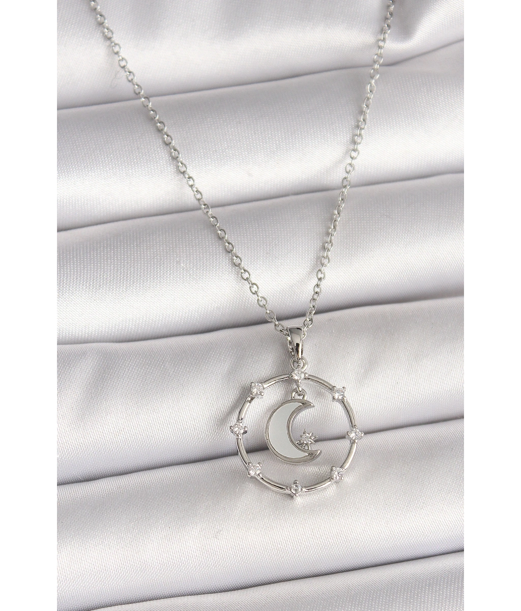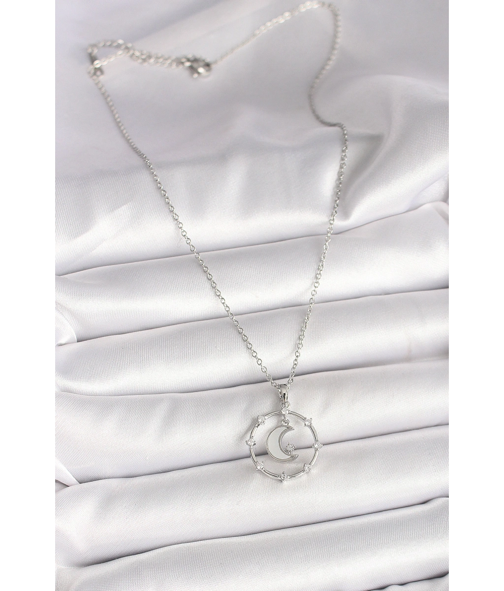 Shoecide 316l Çelik Gümüş Renk Zincir Zirkon Taşlı Beyaz Mineli Hilal Model Kadın Kolye