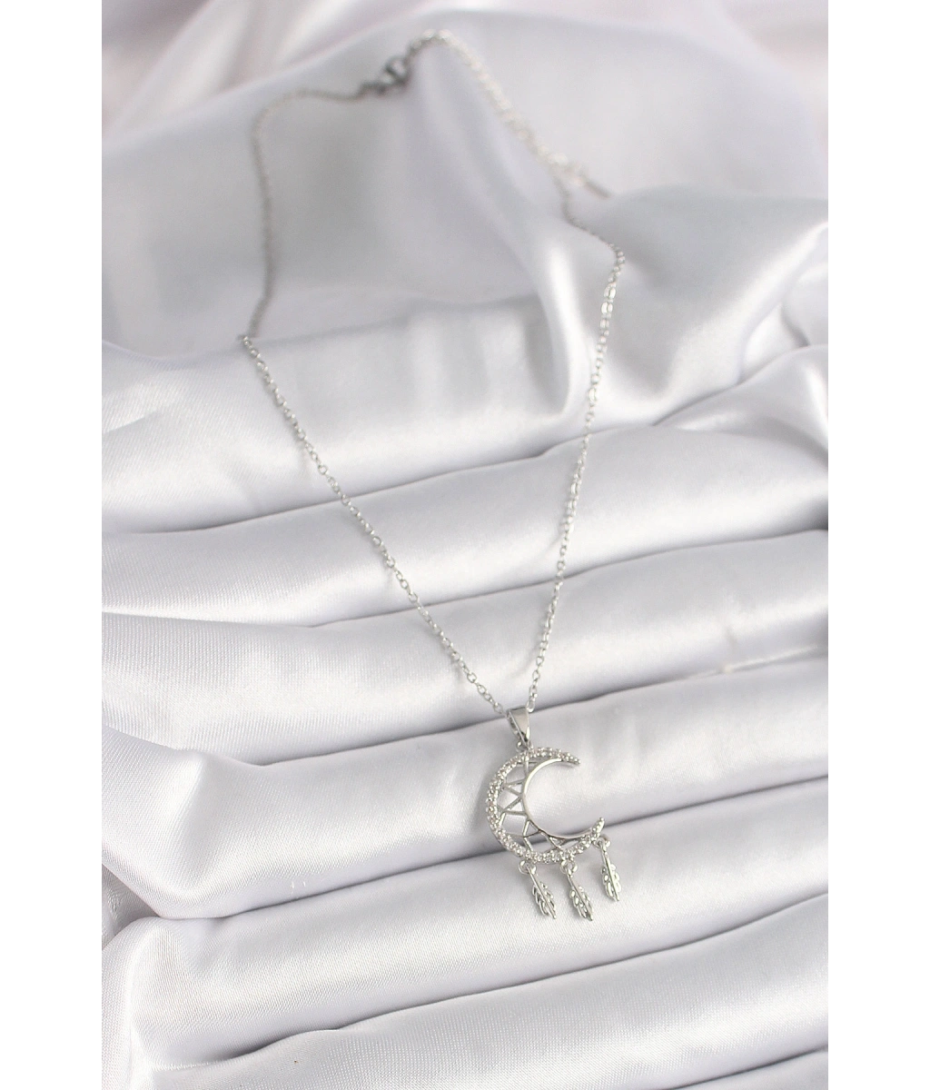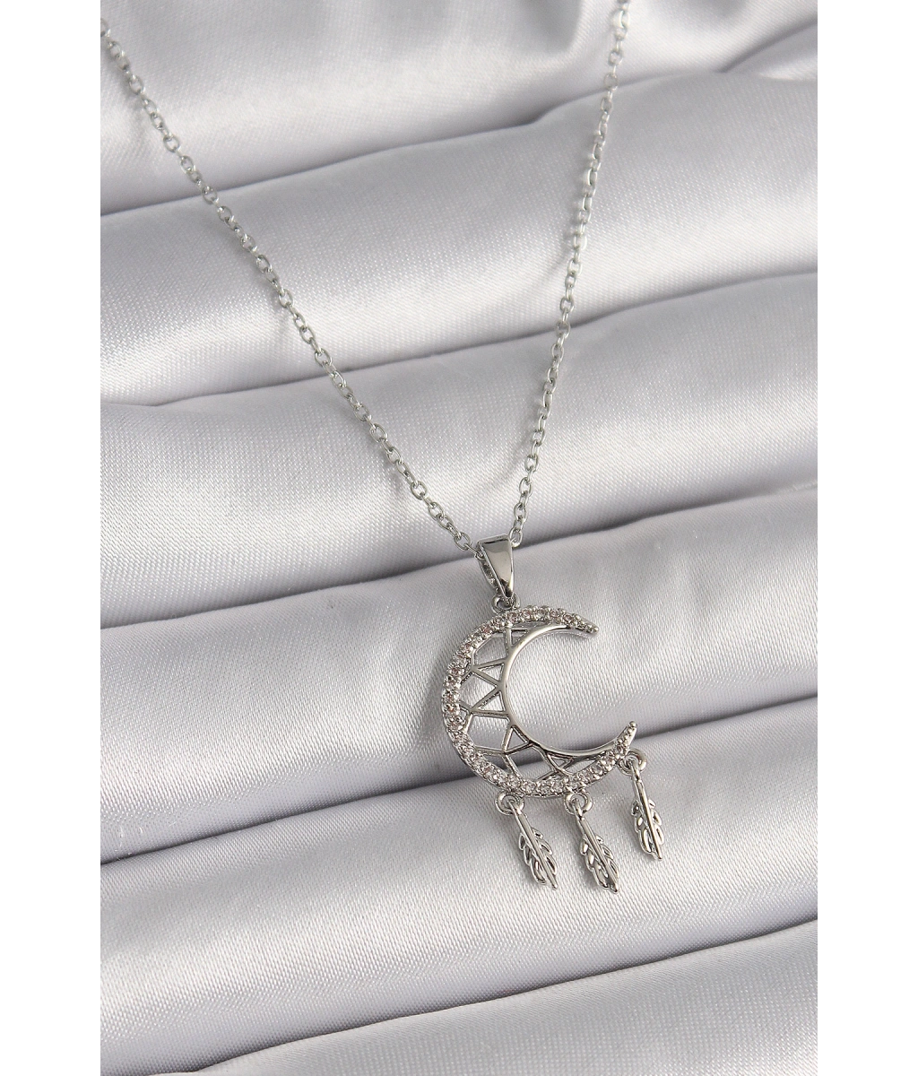 Shoecide 316l Çelik Gümüş Renk Zincir Zirkon Taşlı Hilal Model Sallantı Yaprak Detay Kadın Kolye