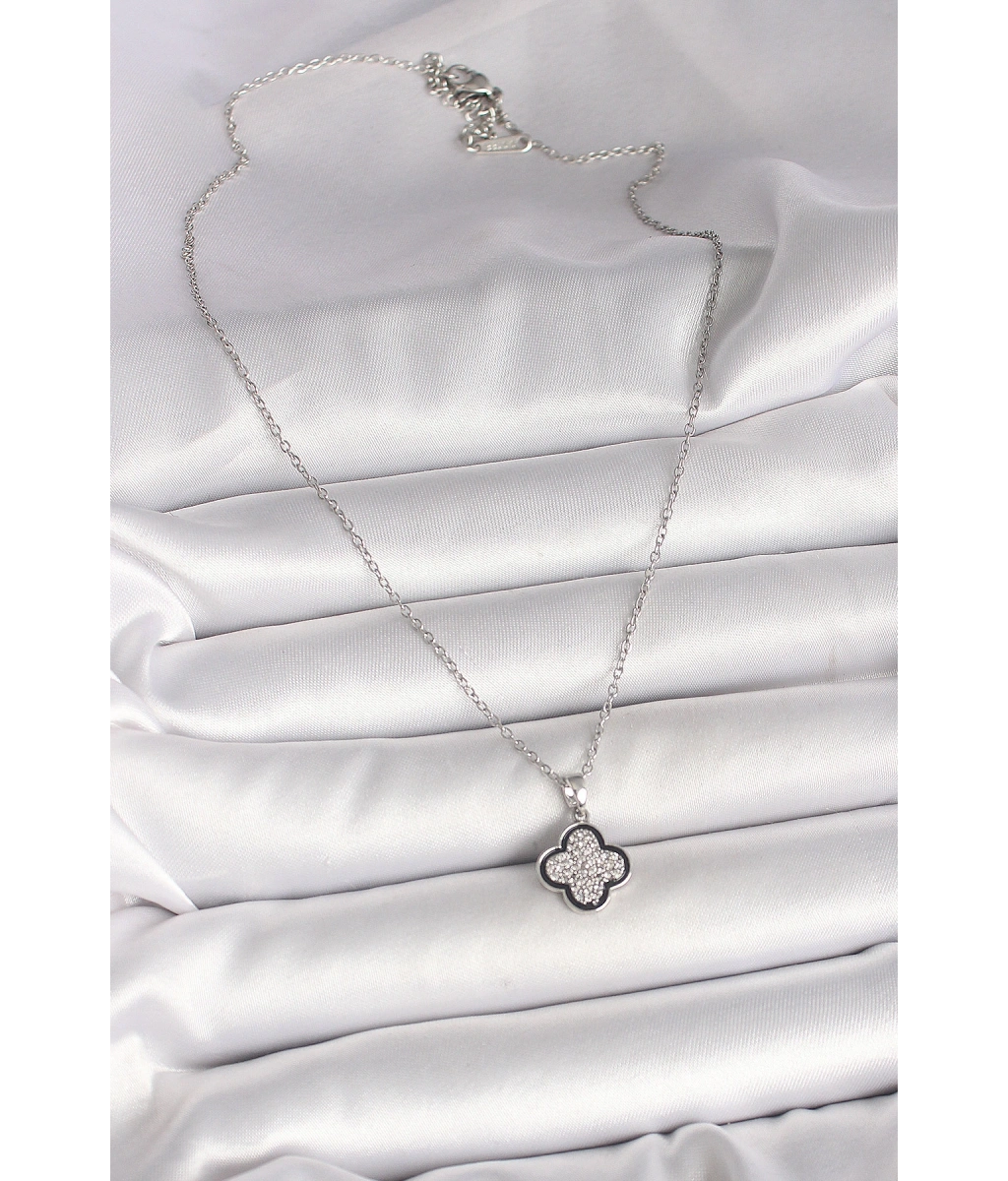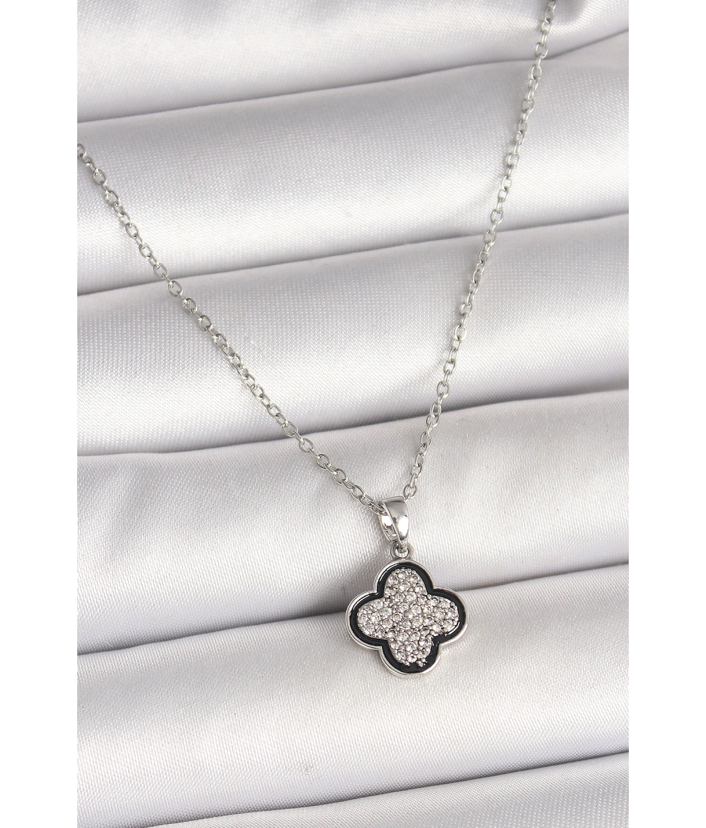 Shoecide 316l Çelik Zincir Gümüş Renk Siyah Ve Zirkon Taşlı Yonca Kadın Kolye