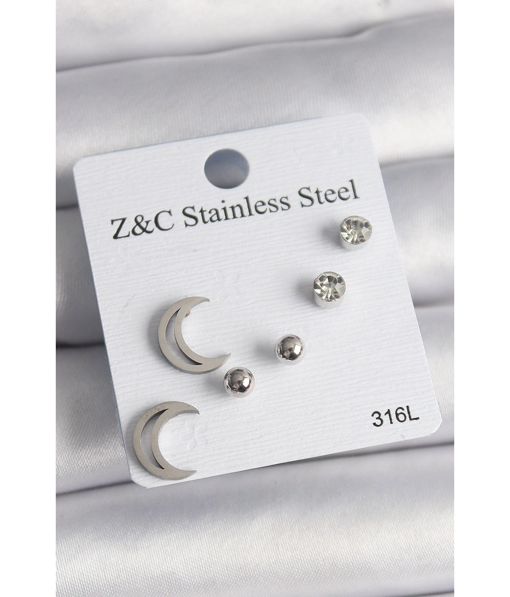 Shoecide 316l Çelik Gümüş Renk Zirkon Taşlı Hilal Model Kadın Küpe Seti