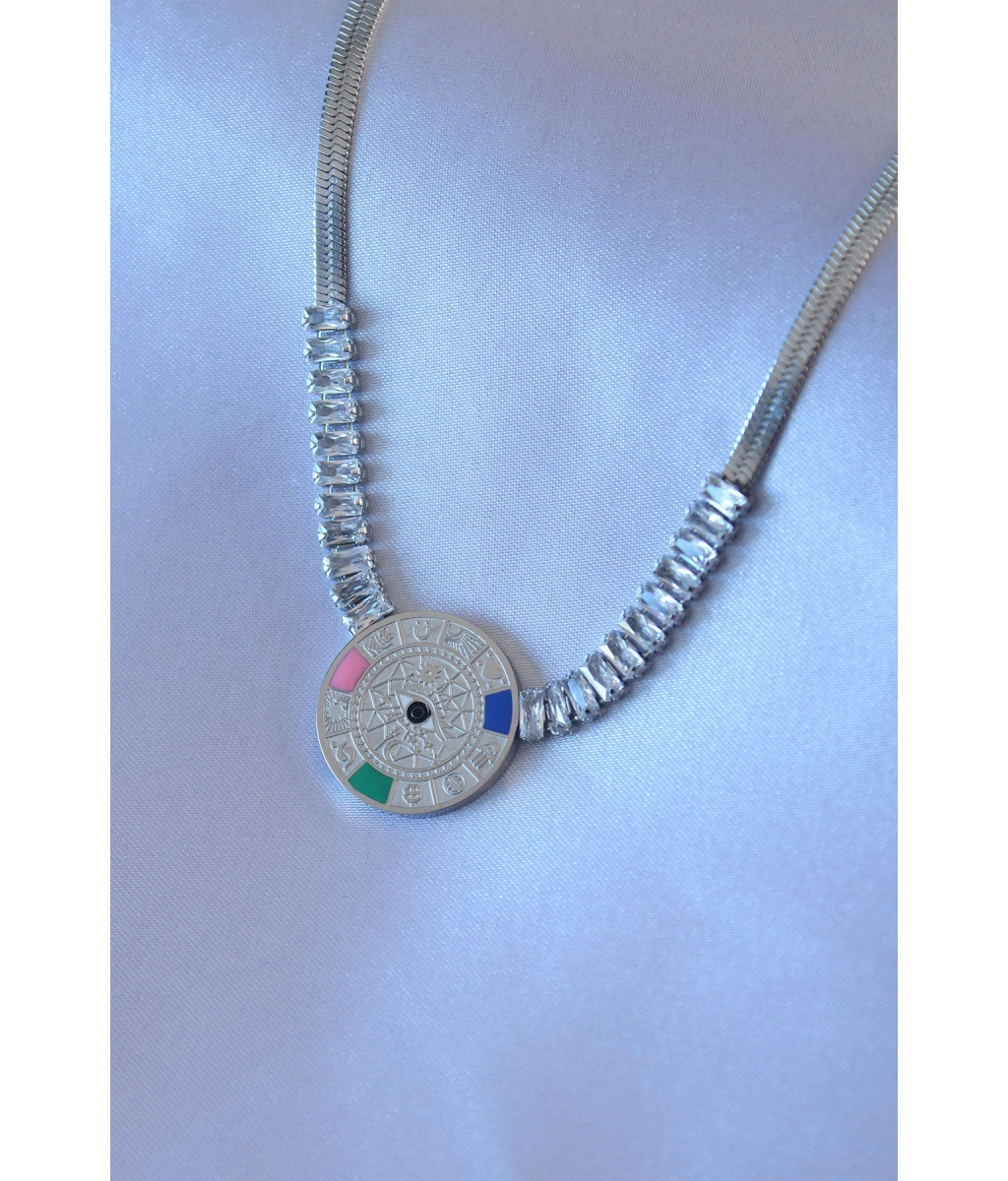 Shoecide 316l Çelik Gümüş Renk Zirkon Taşlı İtalyan Zincir Burç İşeleme Madalyon Model Kadın Kolye