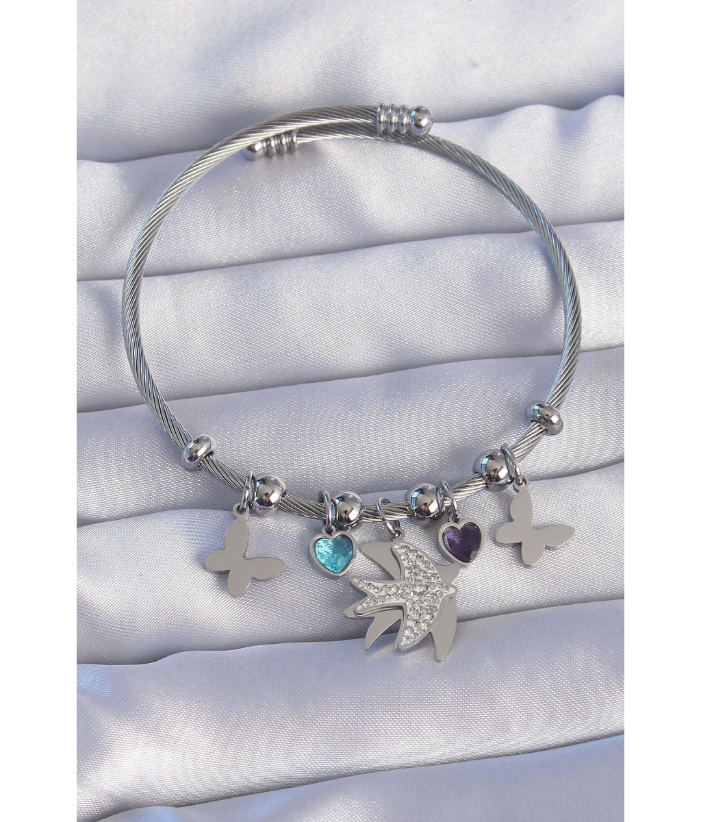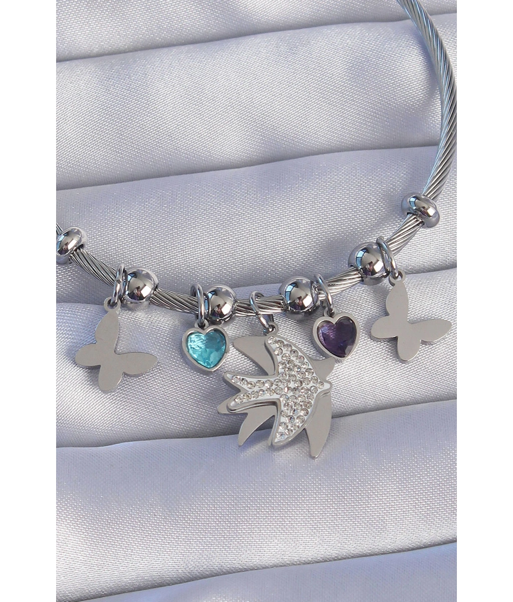 Shoecide 316l Çelik Gümüş Renk Zirkon Taşlı Kuş Tasarımlı Kelebek Detay Charm Bileklik