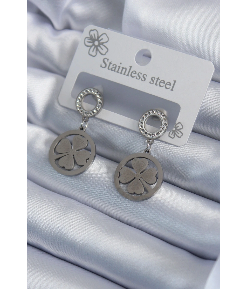 Shoecide 316l Çelik Gümüş Renk Zirkon Taşlı Yonca Model İşleme Detay Kadın Küpe
