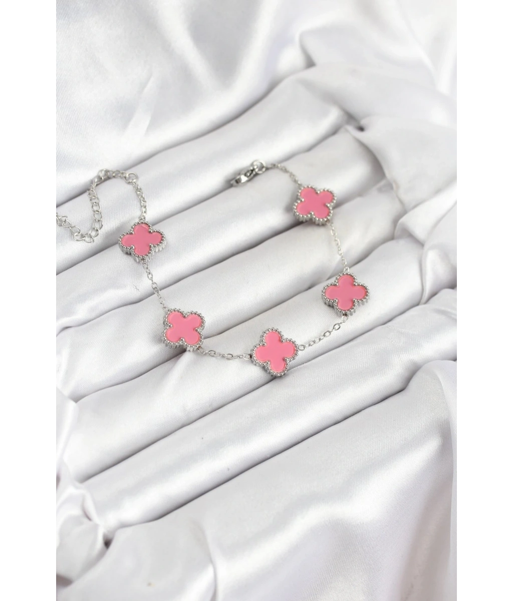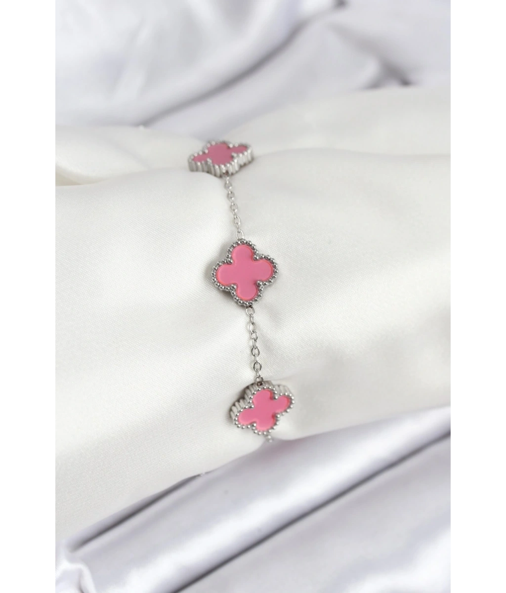 Shoecide 316l Çelik Gümüş Zincir Pembe Renk Yonca Bileklik