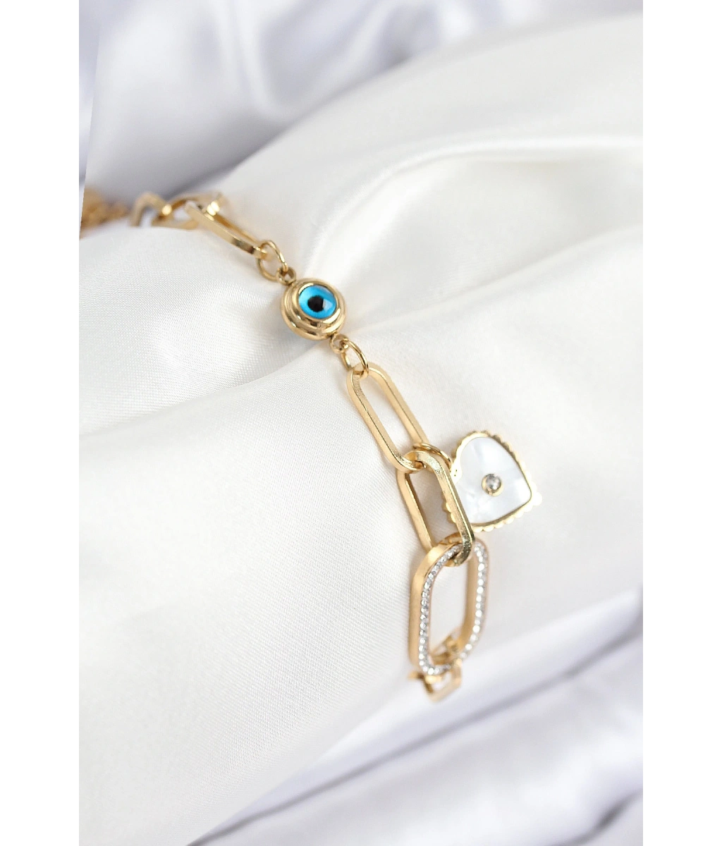 Shoecide 316l Çelik Nazar Boncuğu Ve Zirkon Taşlı Kalp Model Gold Renk Kadın Bileklik