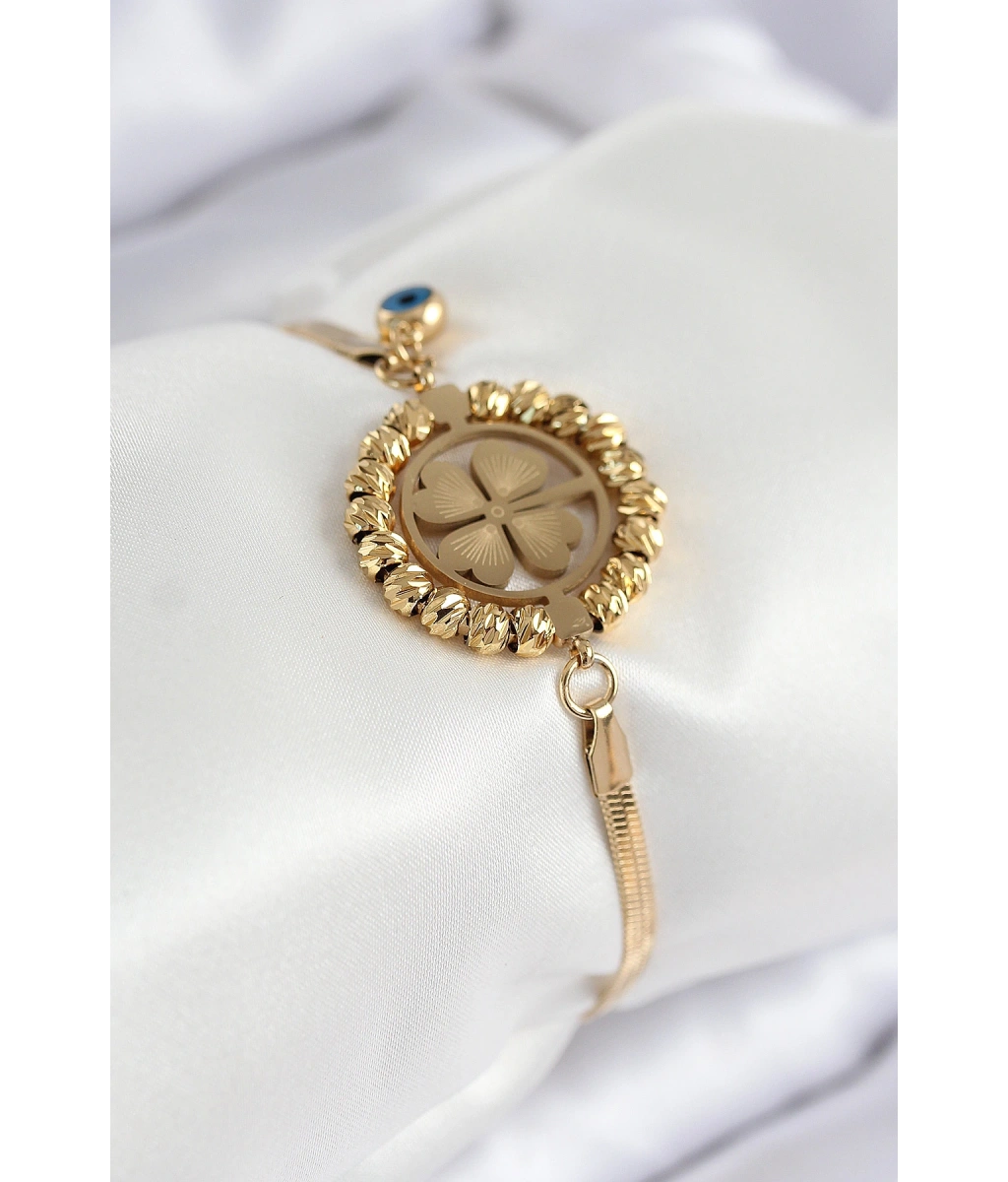 Shoecide 316l Çelik Nazar Boncuk Detaylı Yonca Model İtalyan Zincir Gold Renk Kadın Bileklik