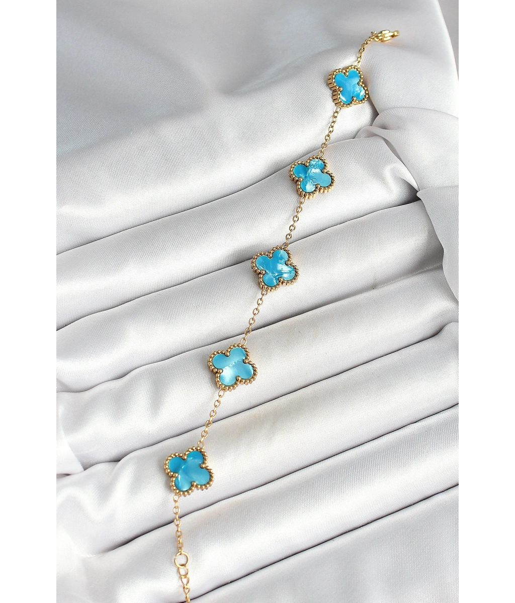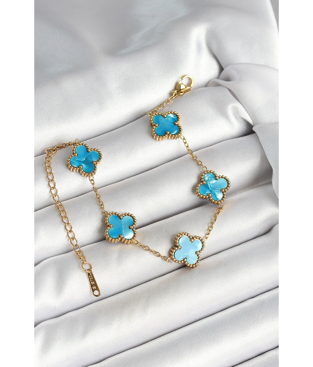 Shoecide 316l Çelik Sedefli Gökyüzü Mavisi Gold Renk Yonca Kadın Bileklik