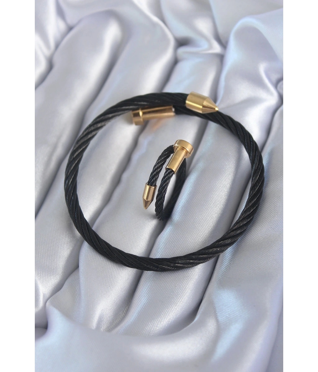 Shoecide 316l Çelik Siyah Renk Gold Detay Sarmal Model Erkek Bileklik Yüzük Kombini