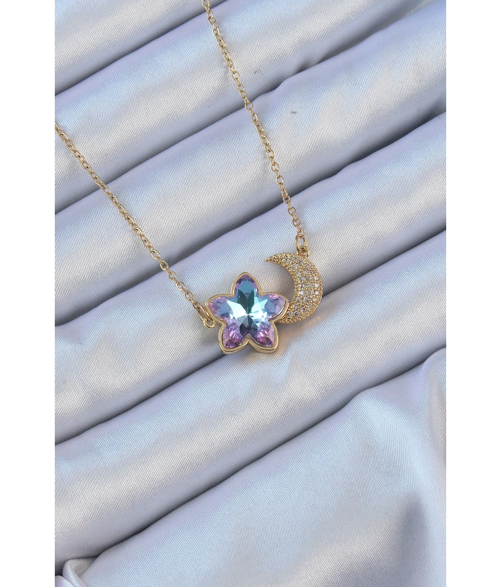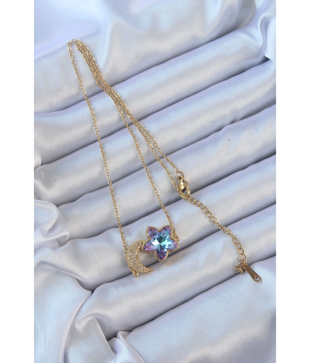 Shoecide 316l Çelik Zincir Altın Renk Ay Tasarımlı Renkli Zirkon Taşlı Çiçek Kolye