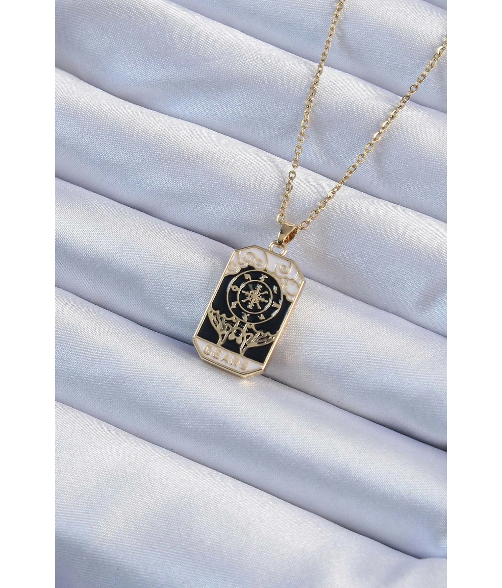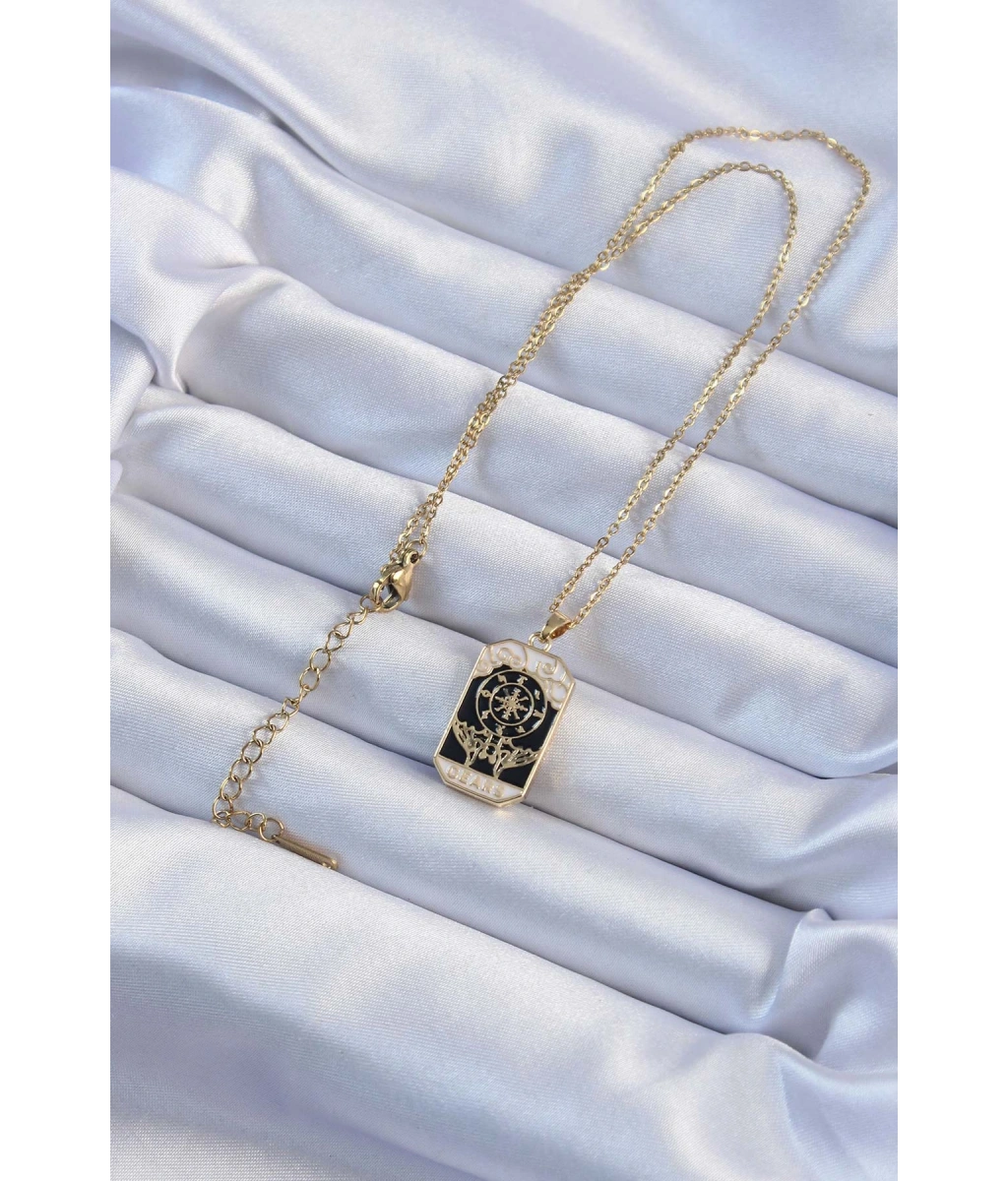 Shoecide 316l Çelik Zincir Altın Renk İşlemeli Siyah Mineli Tarot Kolye