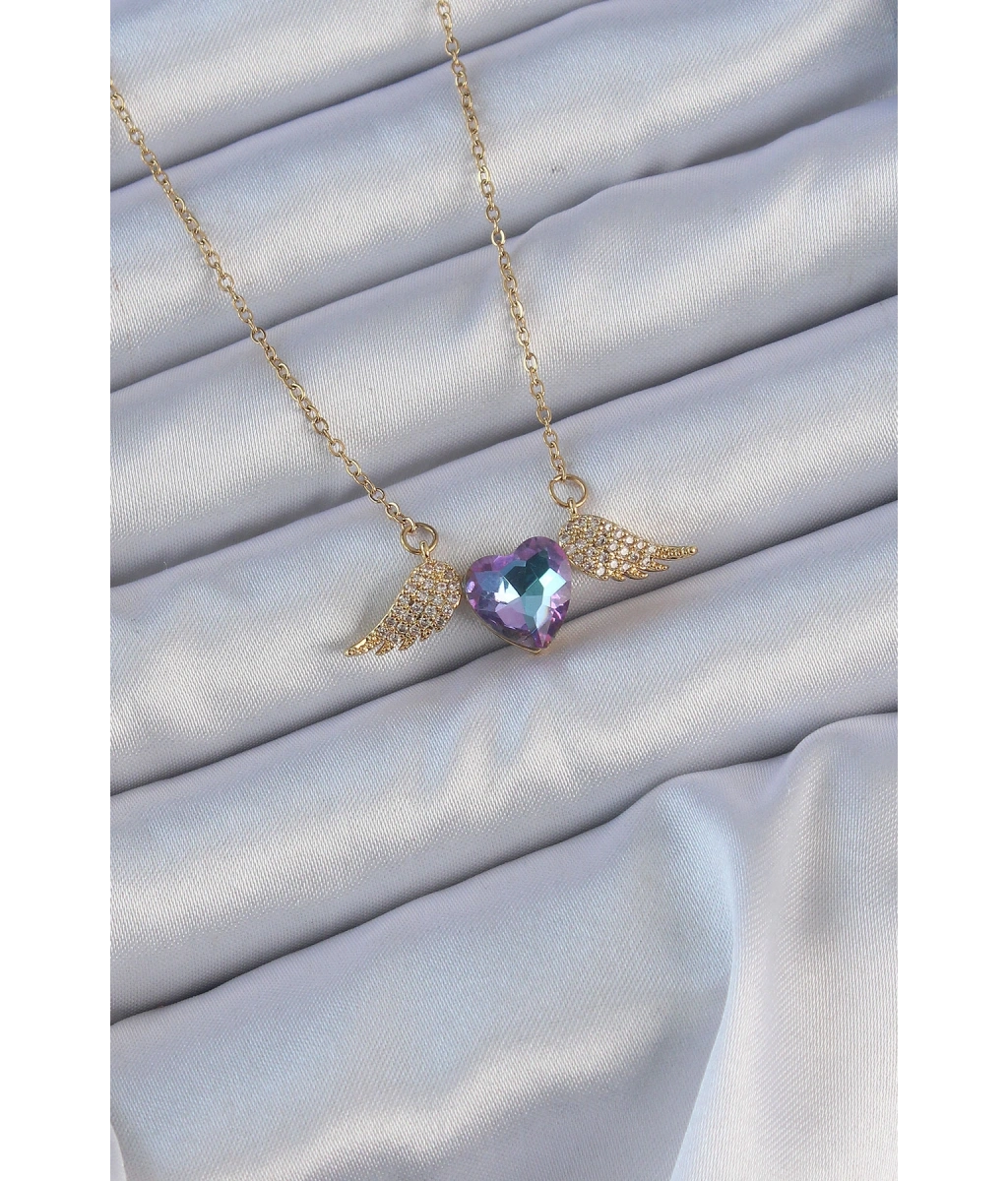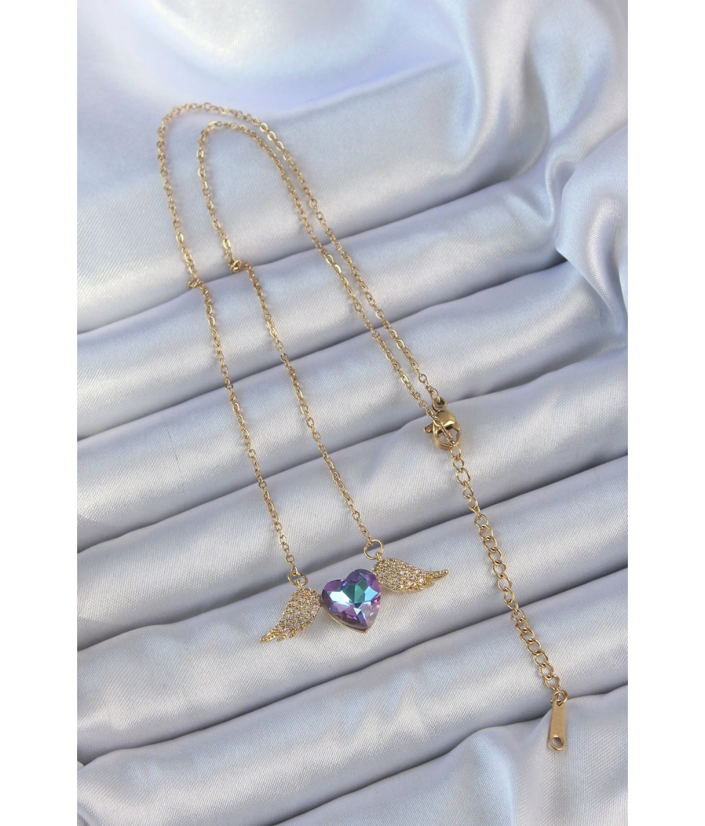 Shoecide 316l Çelik Zincir Altın Renk Mavi Mor Zirkon Taşlı Kanatlı Kalp Kolye