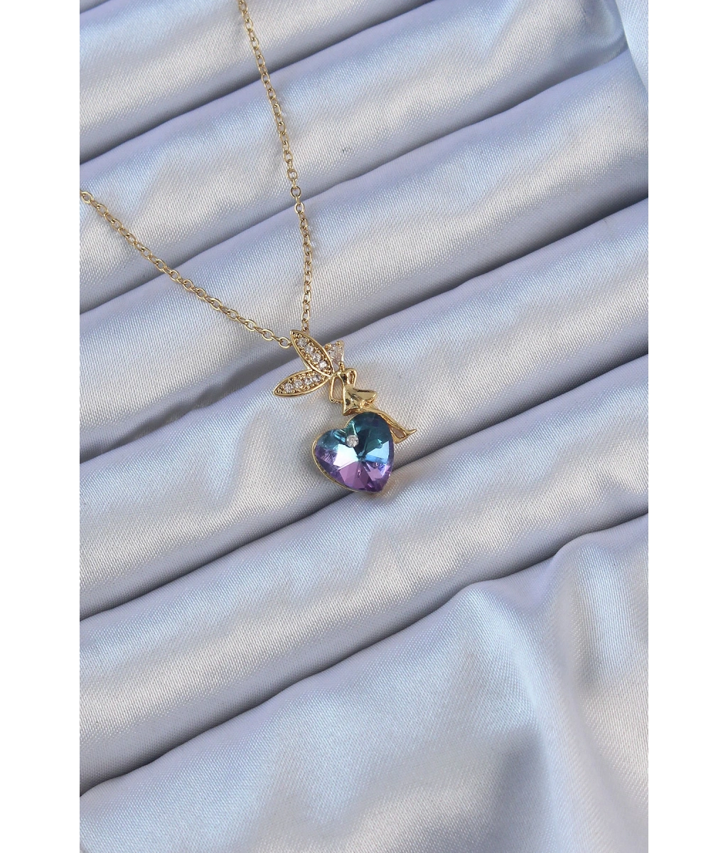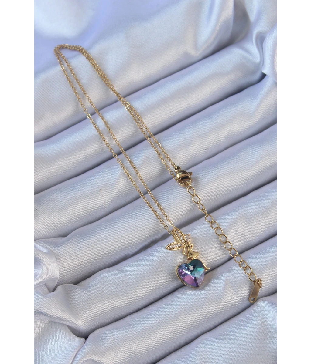 Shoecide 316l Çelik Zincir Altın Renk Mor Mavi Renk Zirkon Taşlı Kalp Detay Peri Kolye