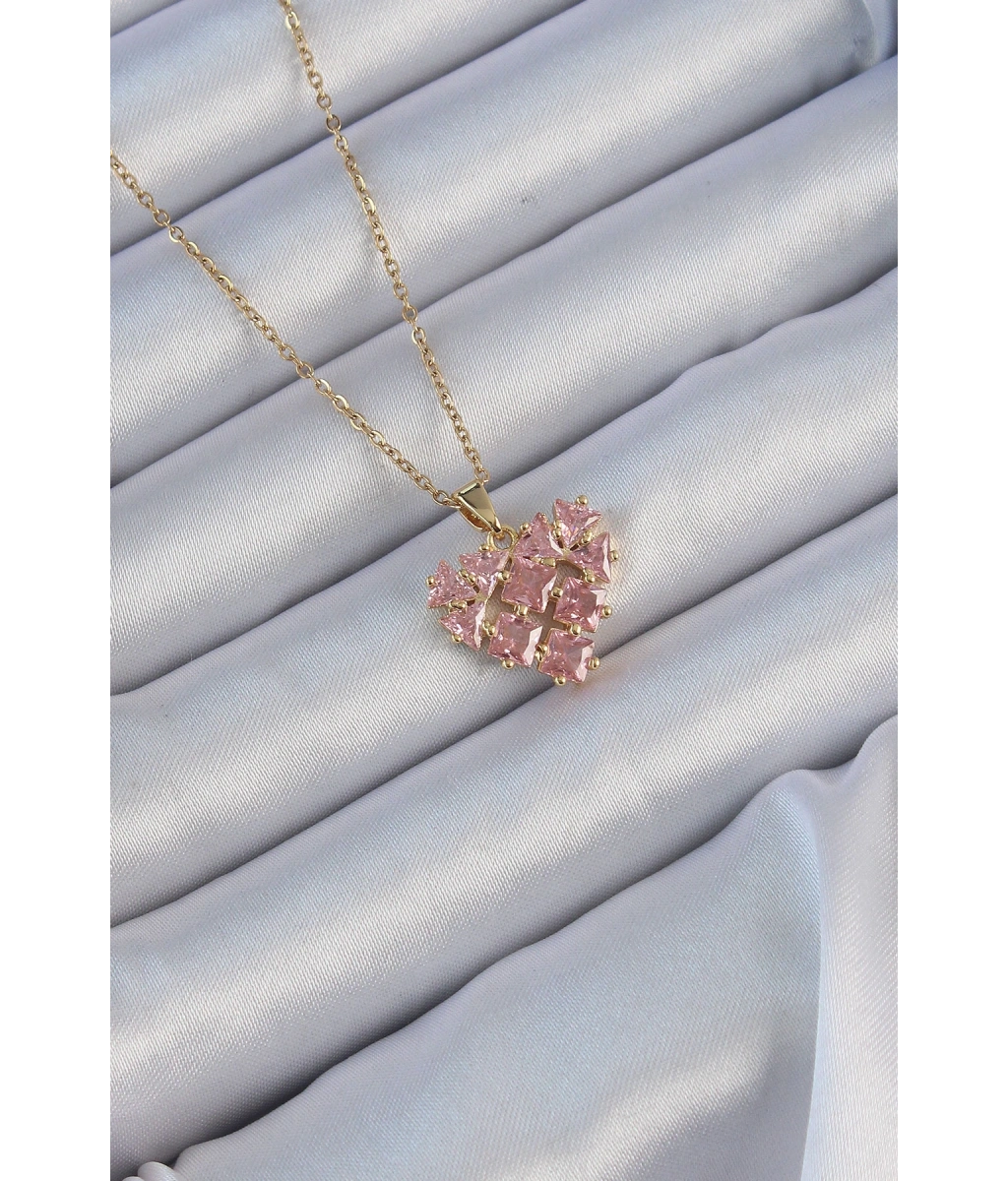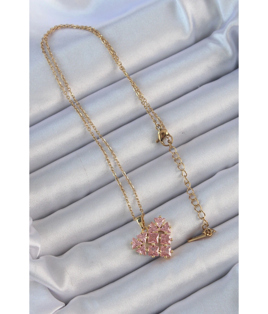 Shoecide 316l Çelik Zincir Altın Renk Pembe Parçalı Zirkon Taşlı Kalp Kolye
