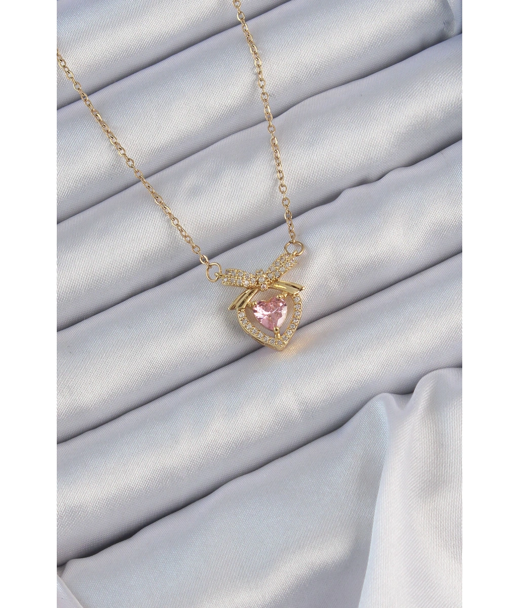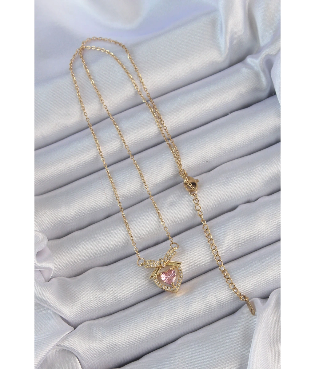 Shoecide 316l Çelik Zincir Altın Renk Pembe Zirkon Taşlı Fiyonklu Kalp Kolye