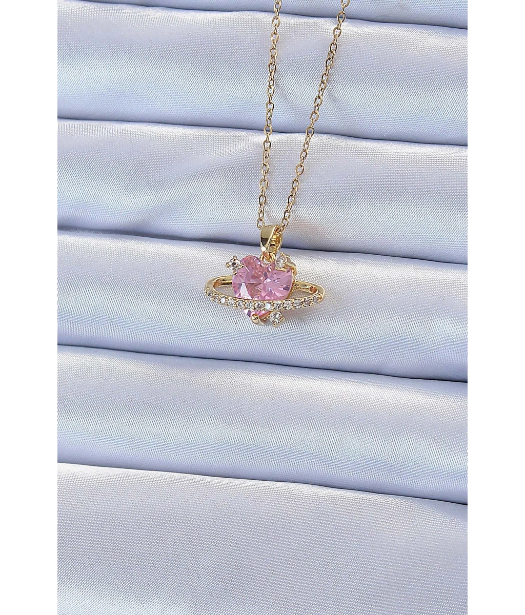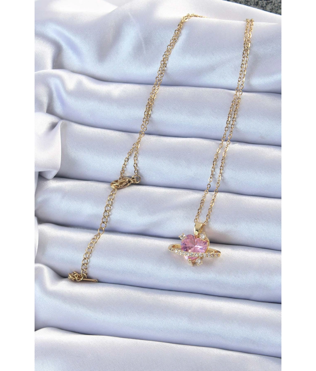 Shoecide 316l Çelik Zincir Altın Renk Pembe Zirkon Taşlı Satürn Görünümlü Kalp Kolye