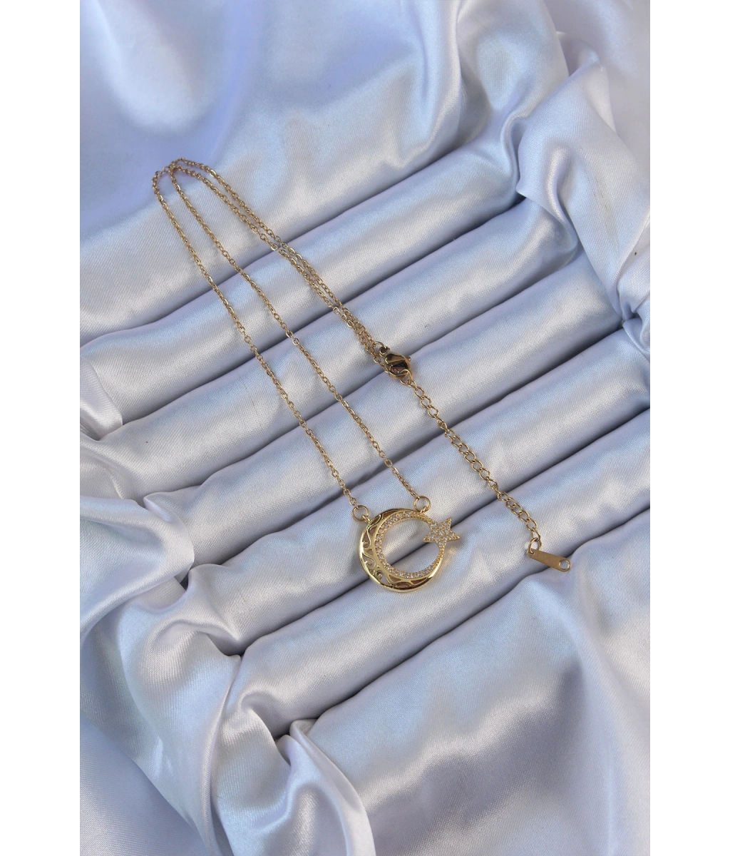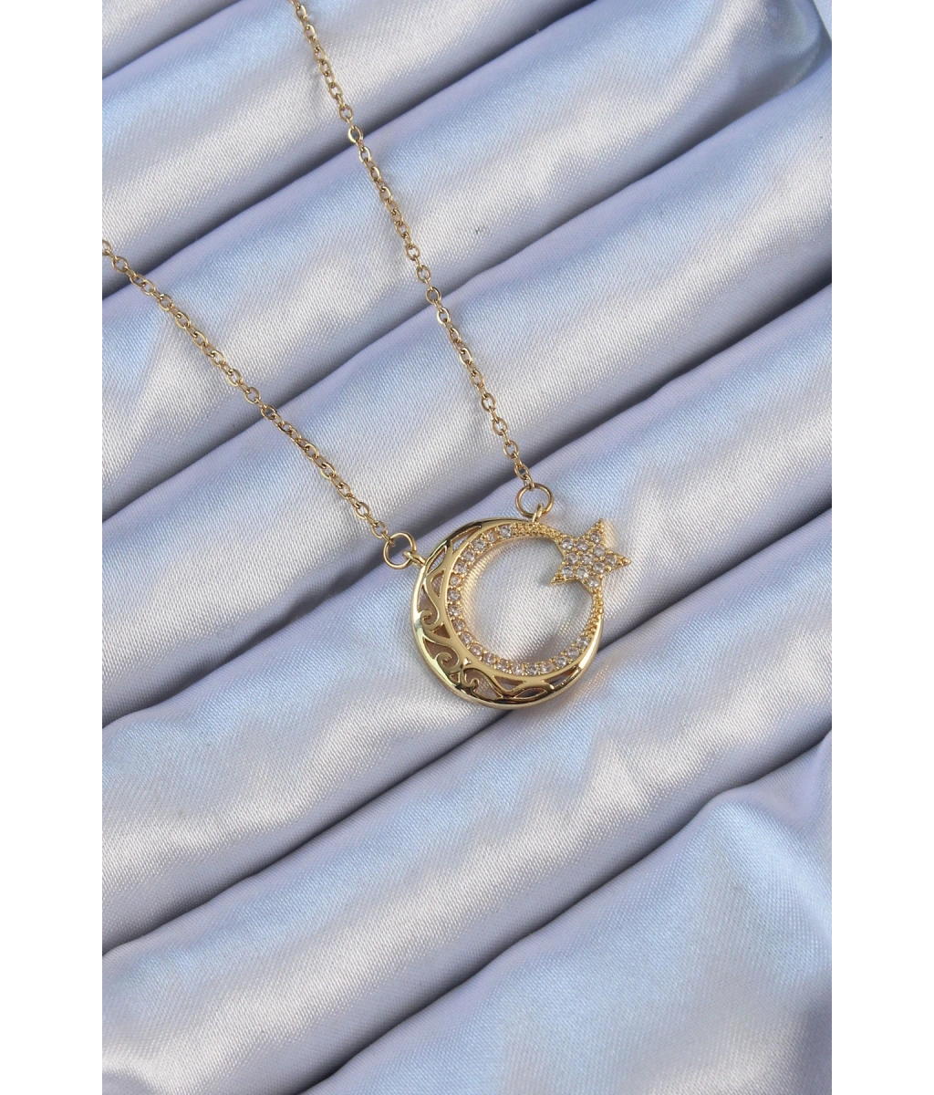 Shoecide 316l Çelik Zincir Altın Renk Zirkon Taşlı Motifli Ay Yıldız Kolye