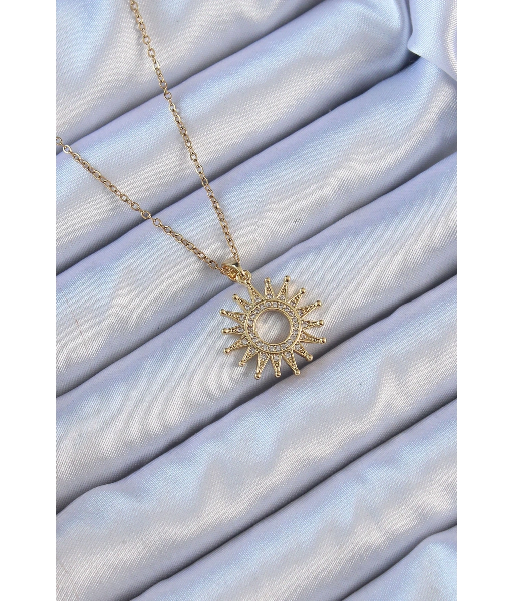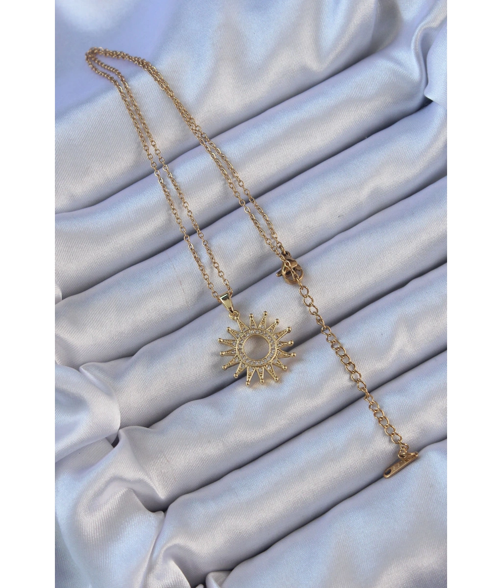 Shoecide 316l Çelik Zincir Altın Renk Zirkon Taşlı Parlayan Güneş Kolye