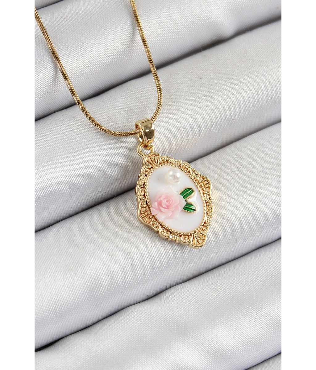 Shoecide 316l Çelik Zincir Beyaz Sanatsal Portre İnci Detaylı Gül Figürlü Model Gold Renk Kadın Kolye