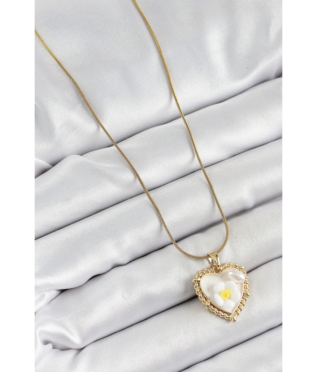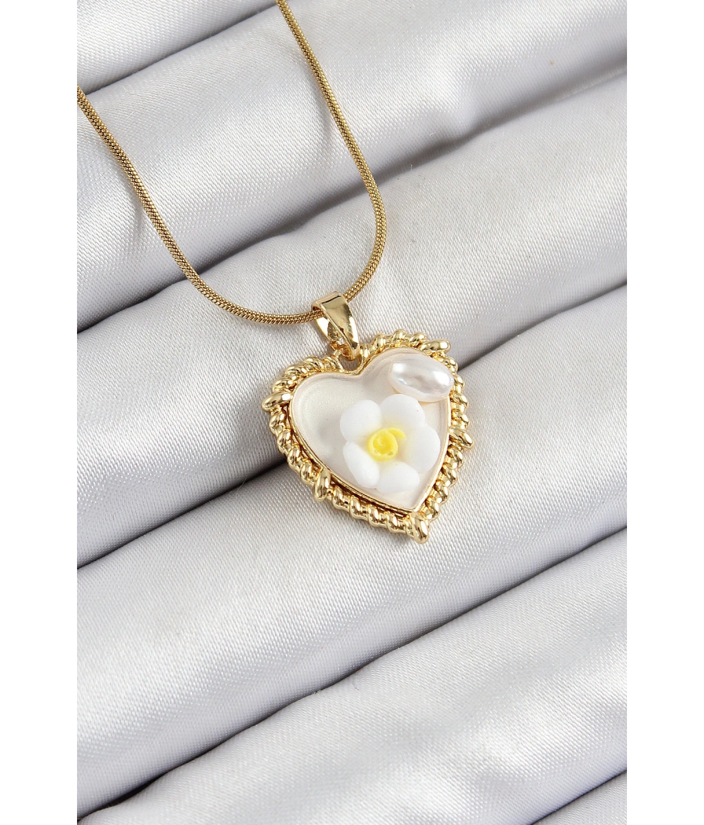 Shoecide 316l Çelik Zincir Beyaz Sanatsal Portre İnci Detaylı Papatya Figürlü Kalp Model Gold Renk Kadın Kolye