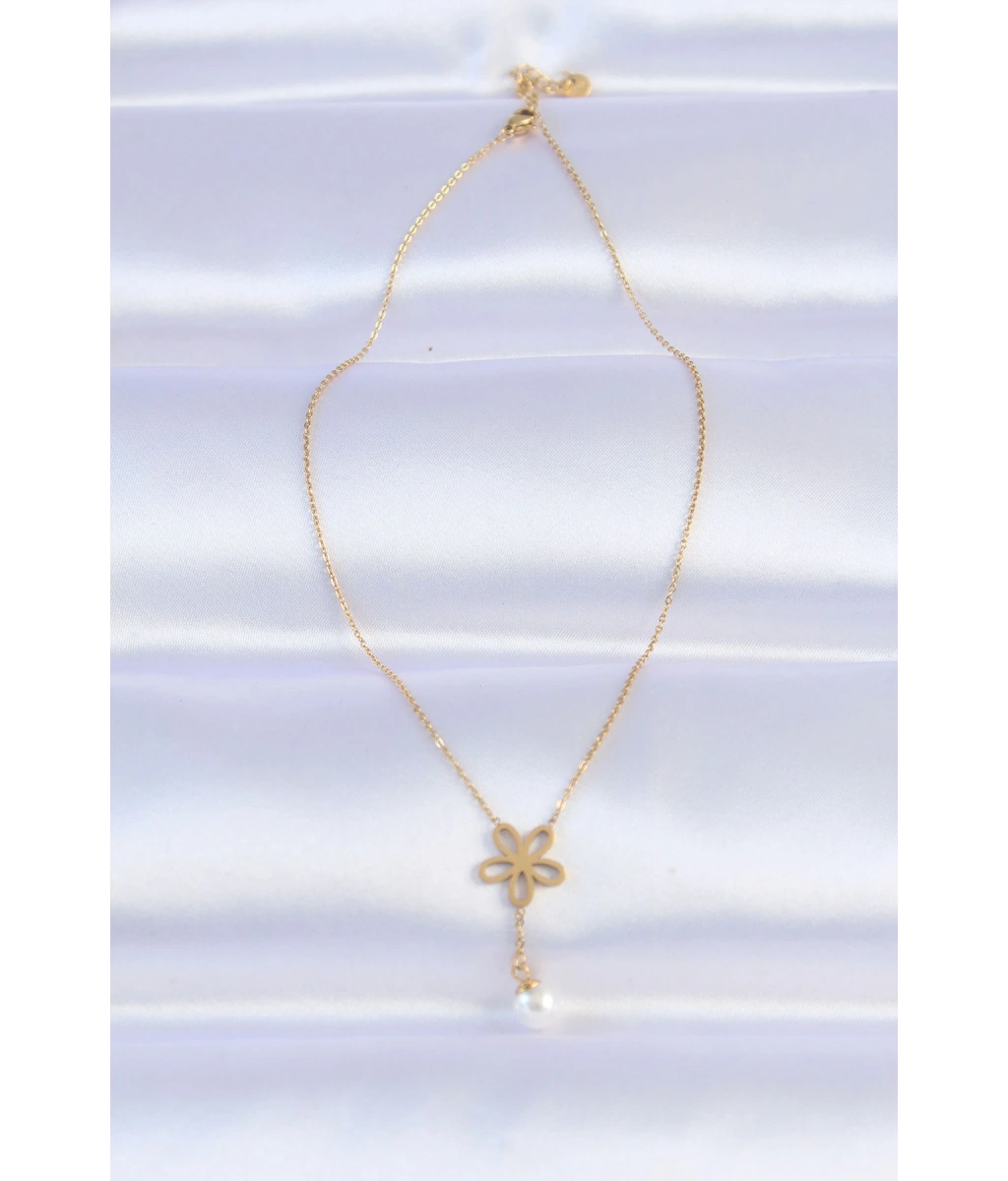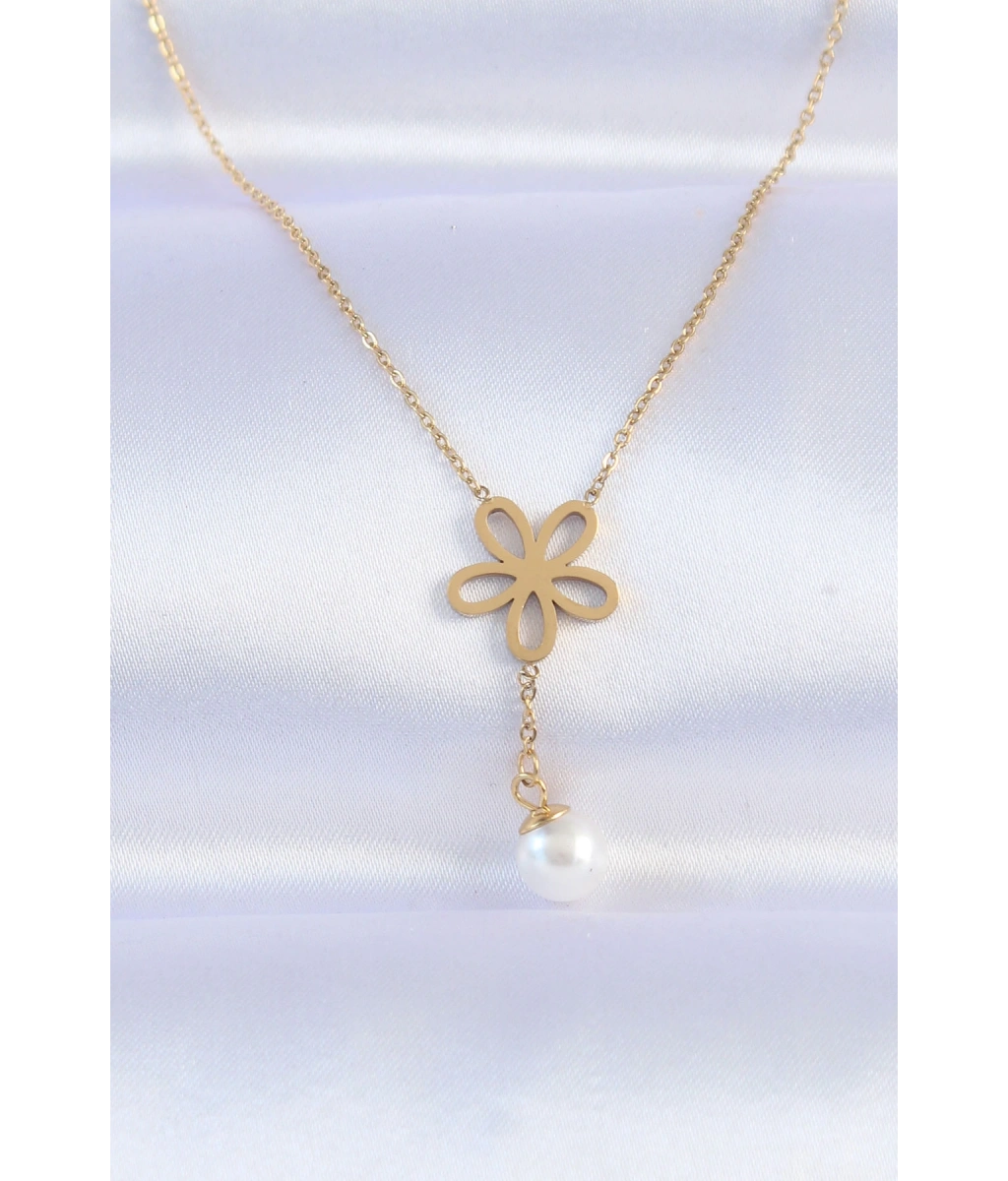 Shoecide 316l Çelik Zincir Gold Renk İnci Detay Çiçek Kolye