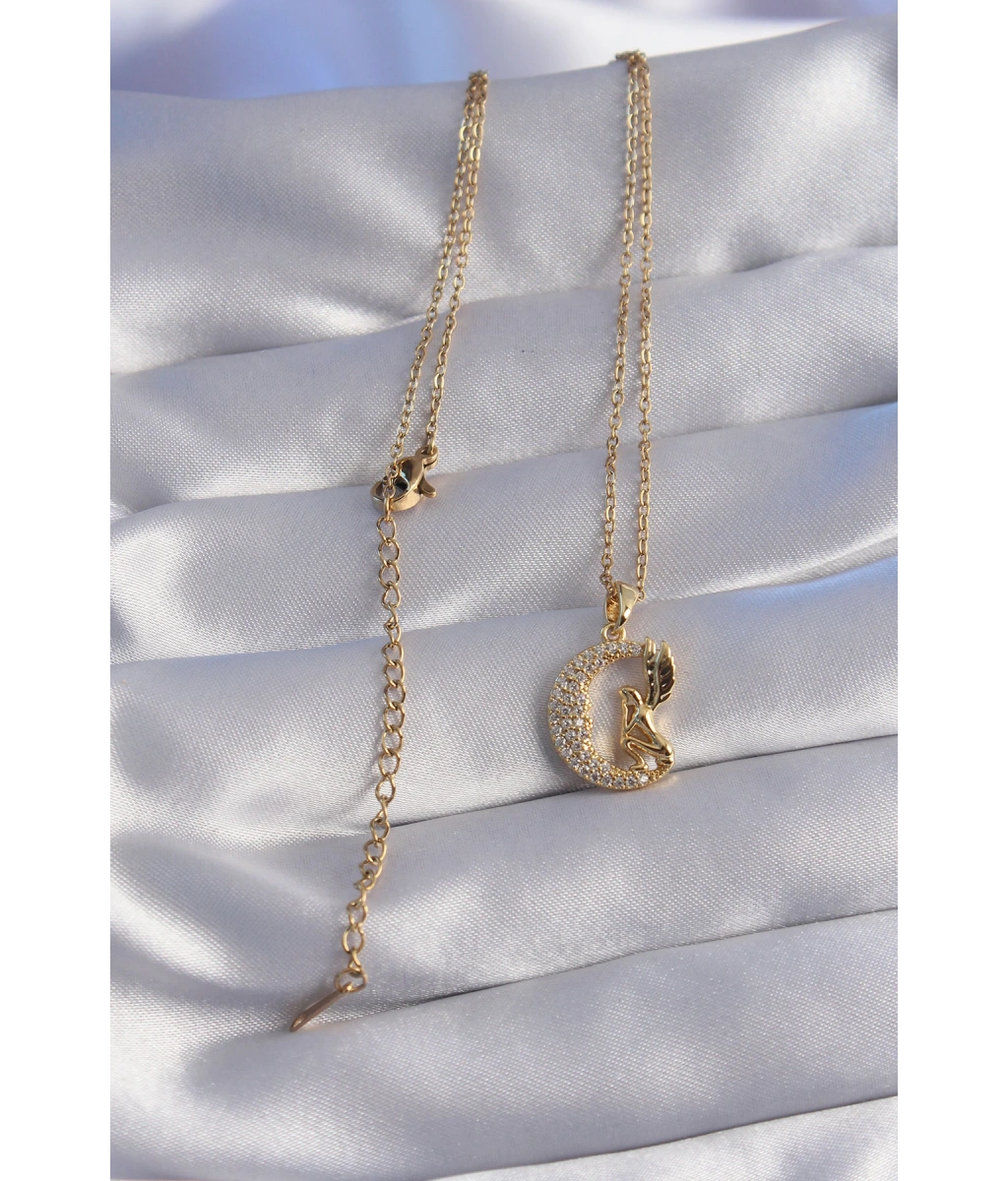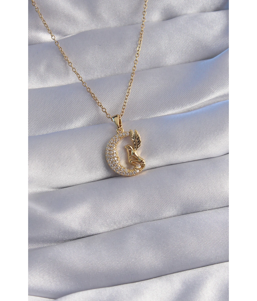 Shoecide 316l Çelik Zincir Gold Renk Kuş Figürlü Zirkon Taşlı Ay Tasarımlı Kolye