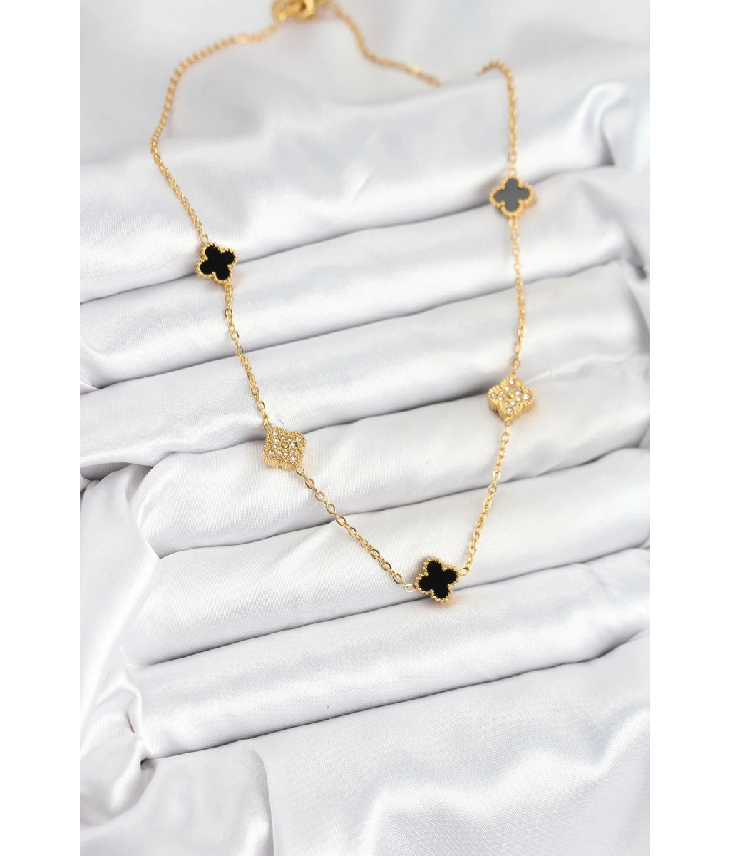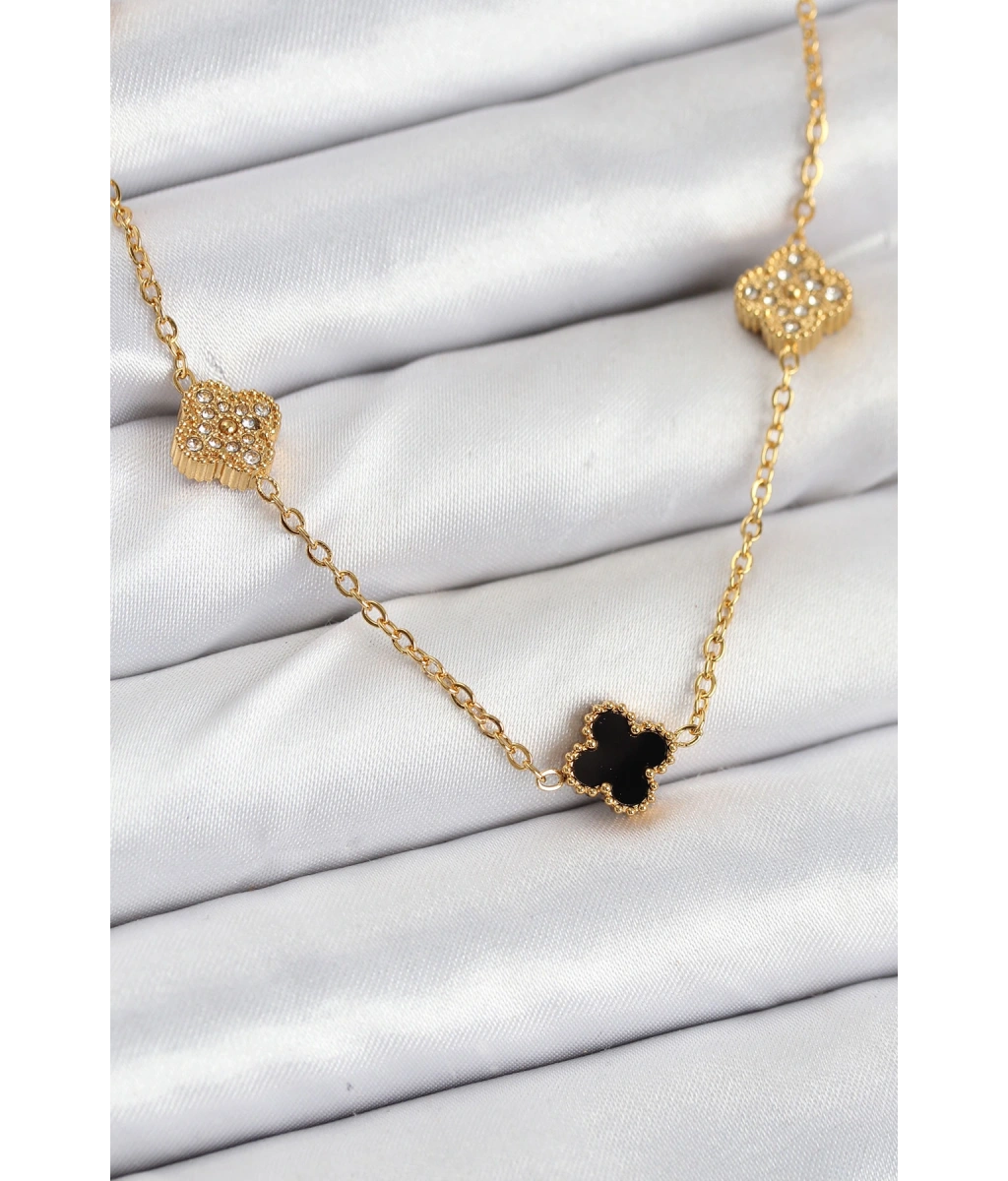 Shoecide 316l Çelik Zincir Gold Renk Siyah Ve Zirkon Taşlı Baby Boy Yonca Kadın Kolye