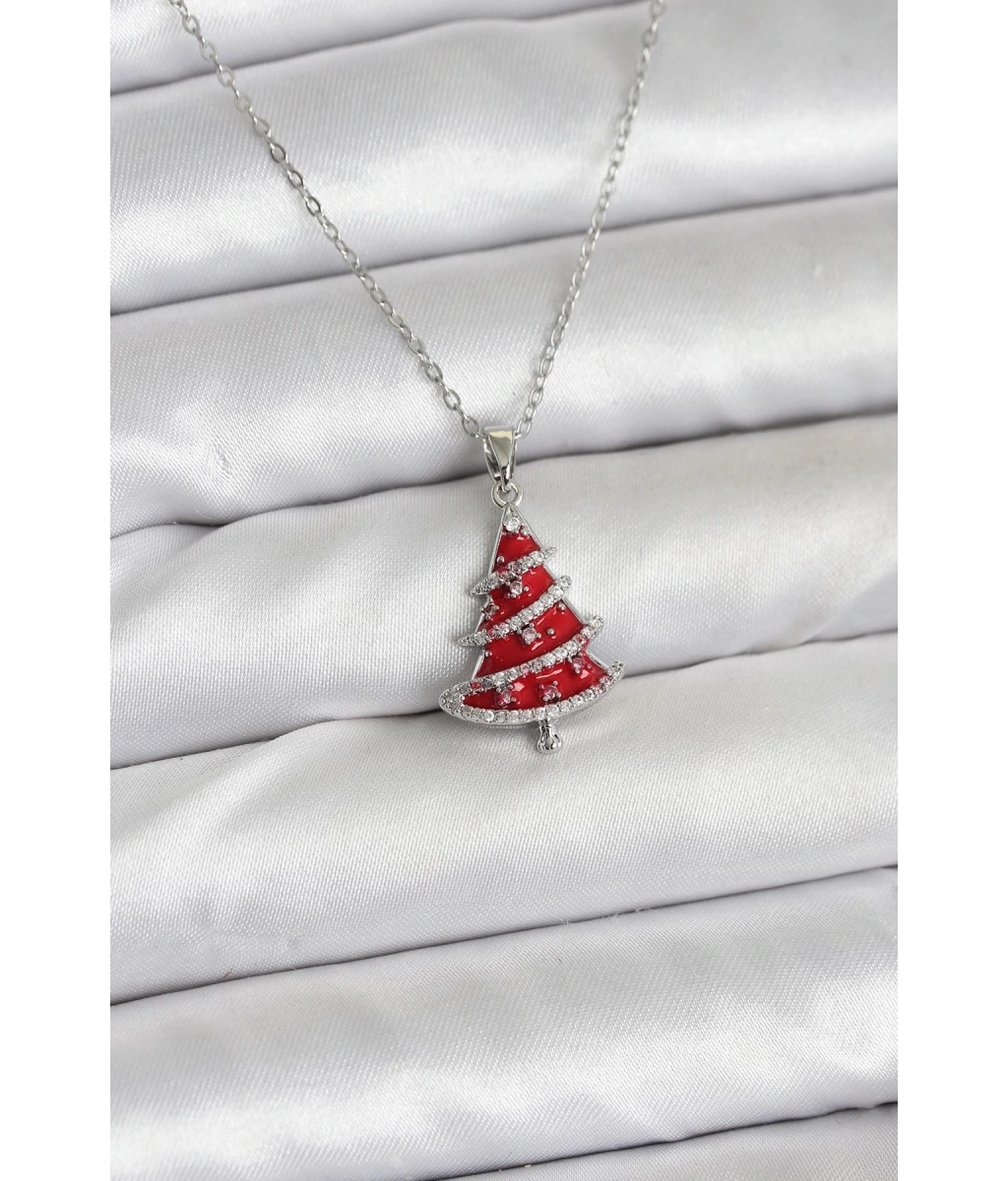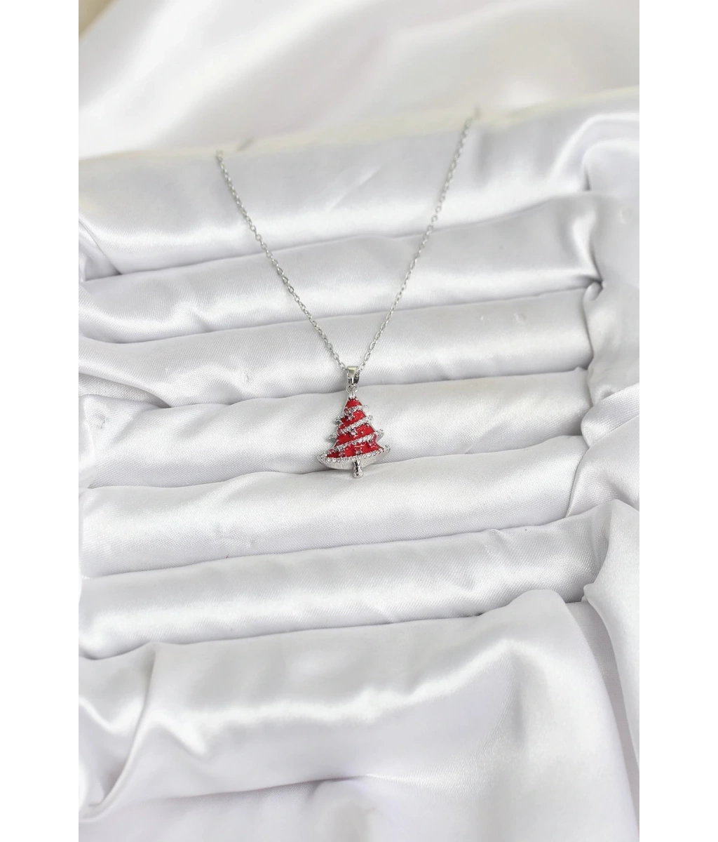Shoecide 316l Çelik Zincir Gümüş Renk Kırmızı Çam Ağacı Model Yılbaşı Temalı Kadın Kolye