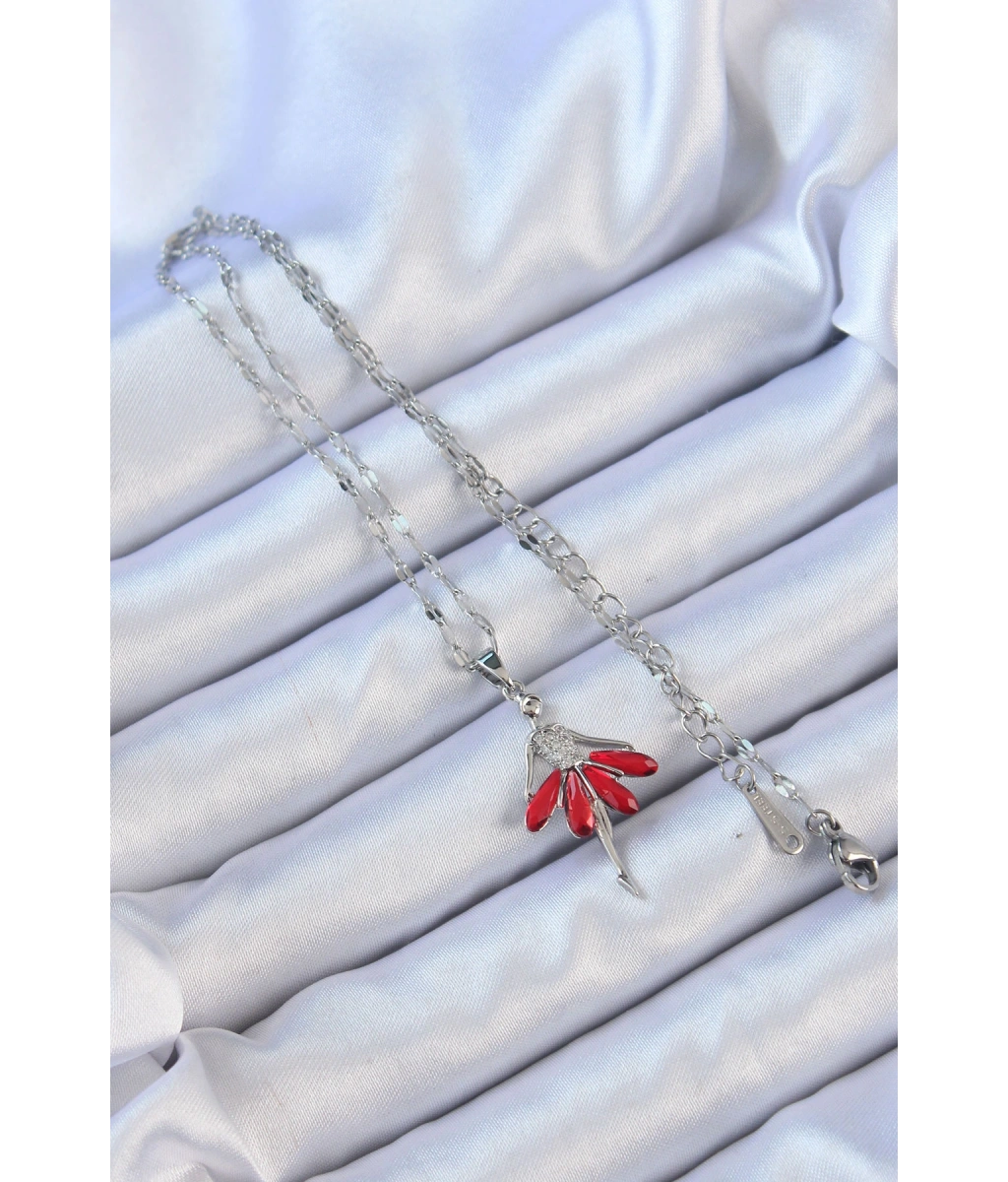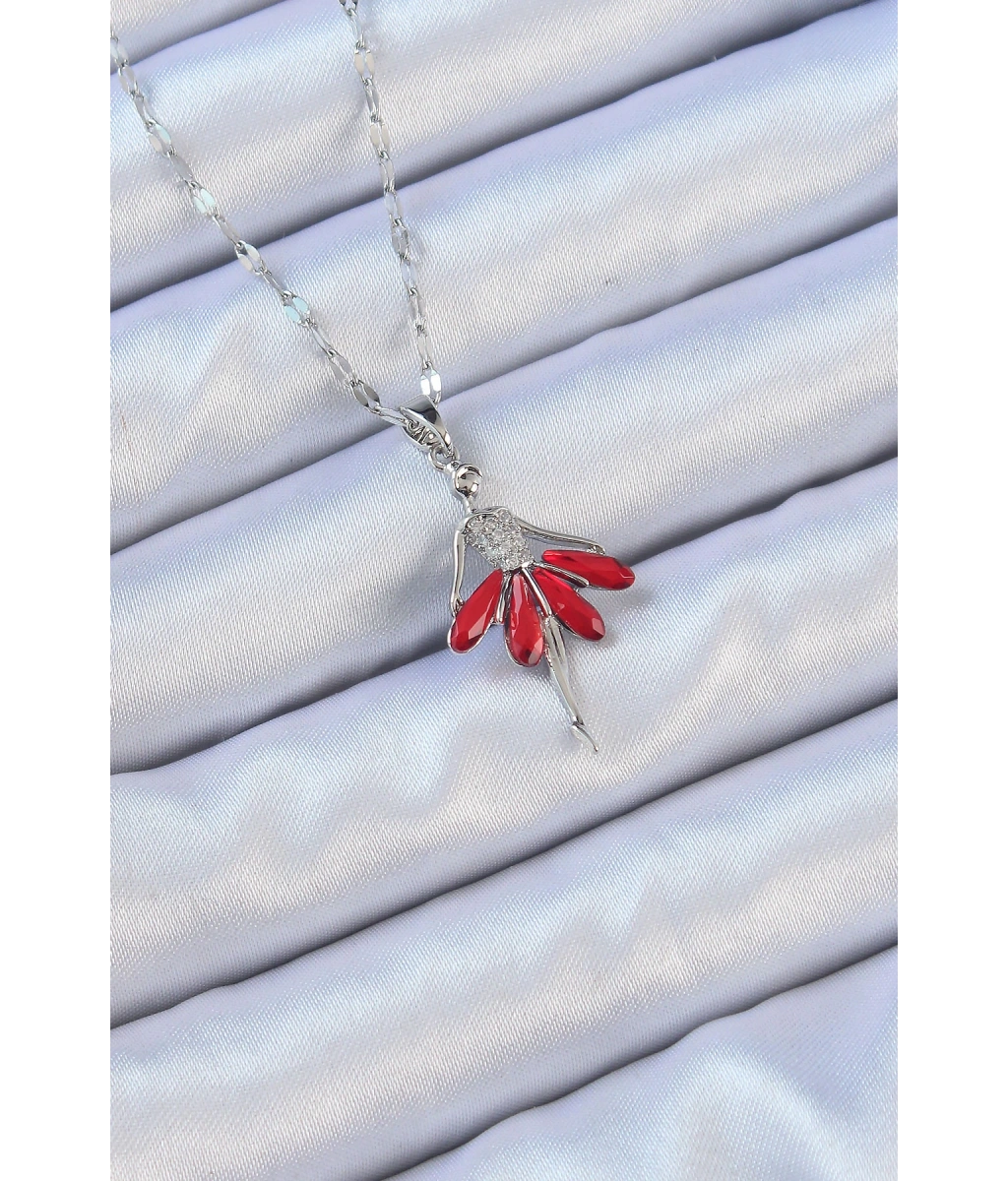 Shoecide 316l Çelik Zincir Gümüş Renk Kırmızı Etekli Zirkon Taşlı Balerin Kolye