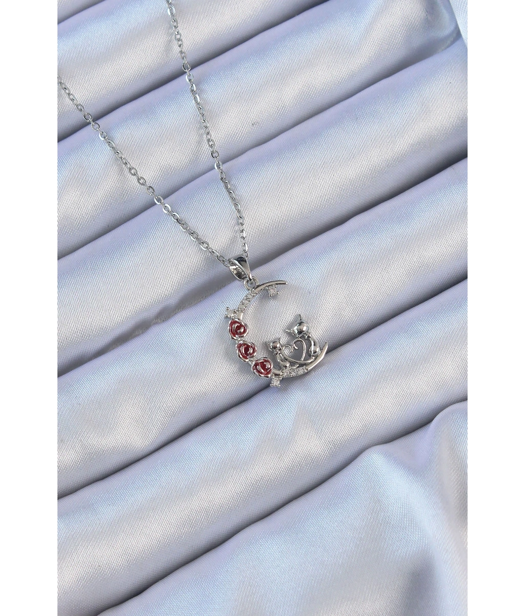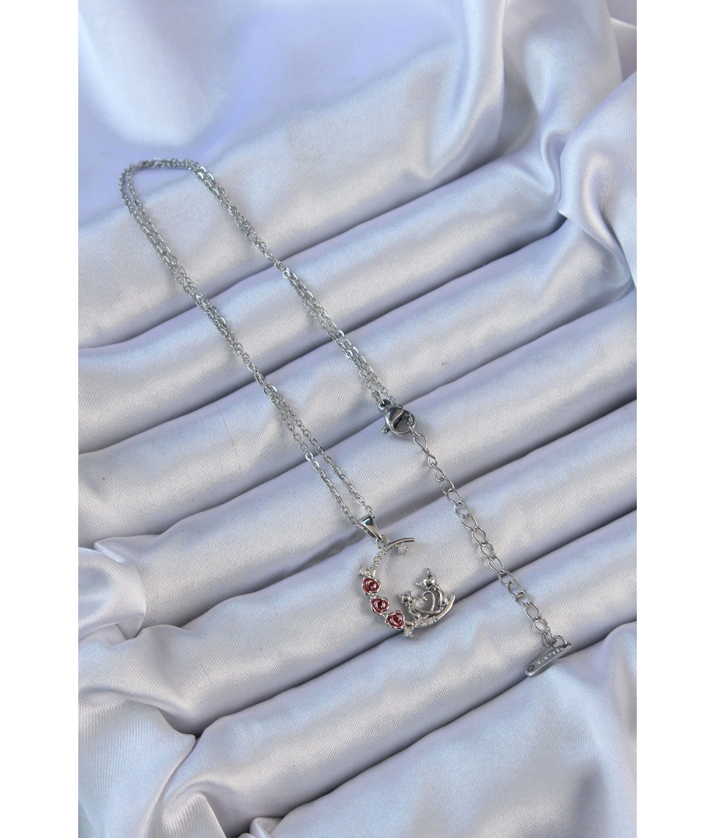 Shoecide 316l Çelik Zincir Gümüş Renk Kırmızı Gül Detay Kedi Figür Zirkon Taşlı Ay Kolye