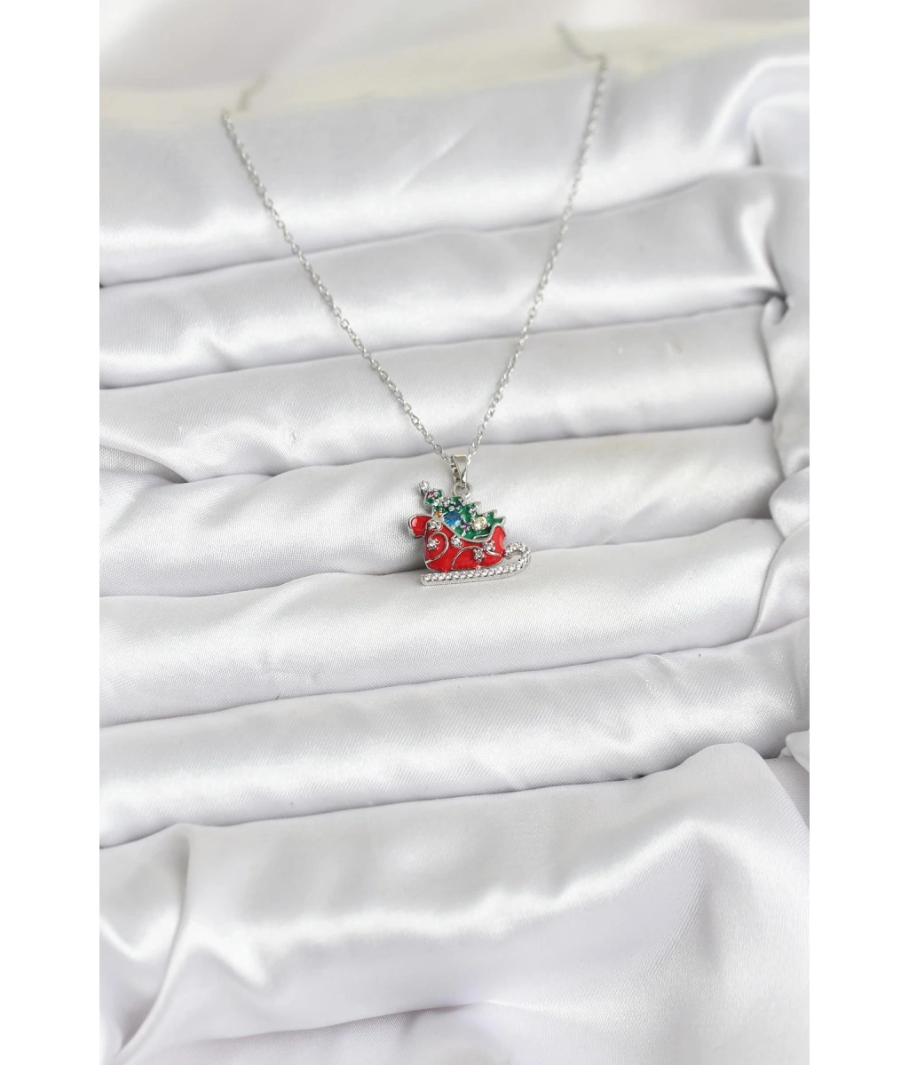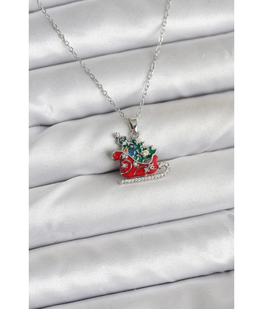 Shoecide 316l Çelik Zincir Gümüş Renk Kızak Ve Çam Ağacı Figürlü Yılbaşı Temalı Kadın Kolye