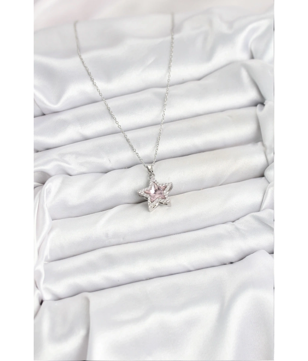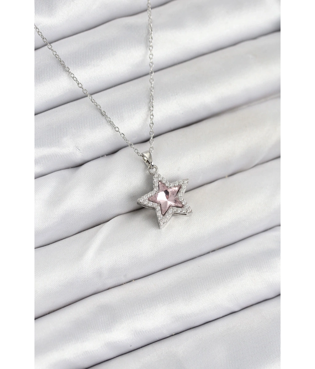 Shoecide 316l Çelik Zincir Gümüş Renk Pembe Taşlı Yıldız Model Kadın Kolye
