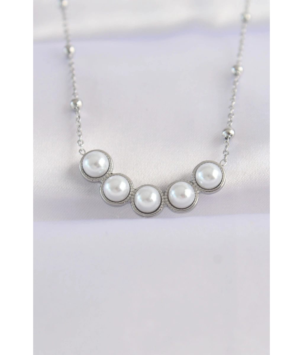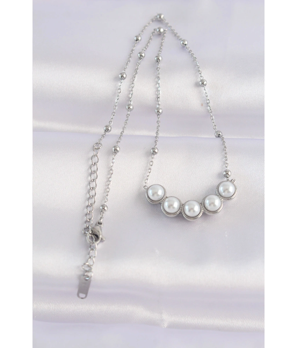 Shoecide 316l Çelik Zincir Gümüş Renk Sıralı İnci Taşlı Kolye