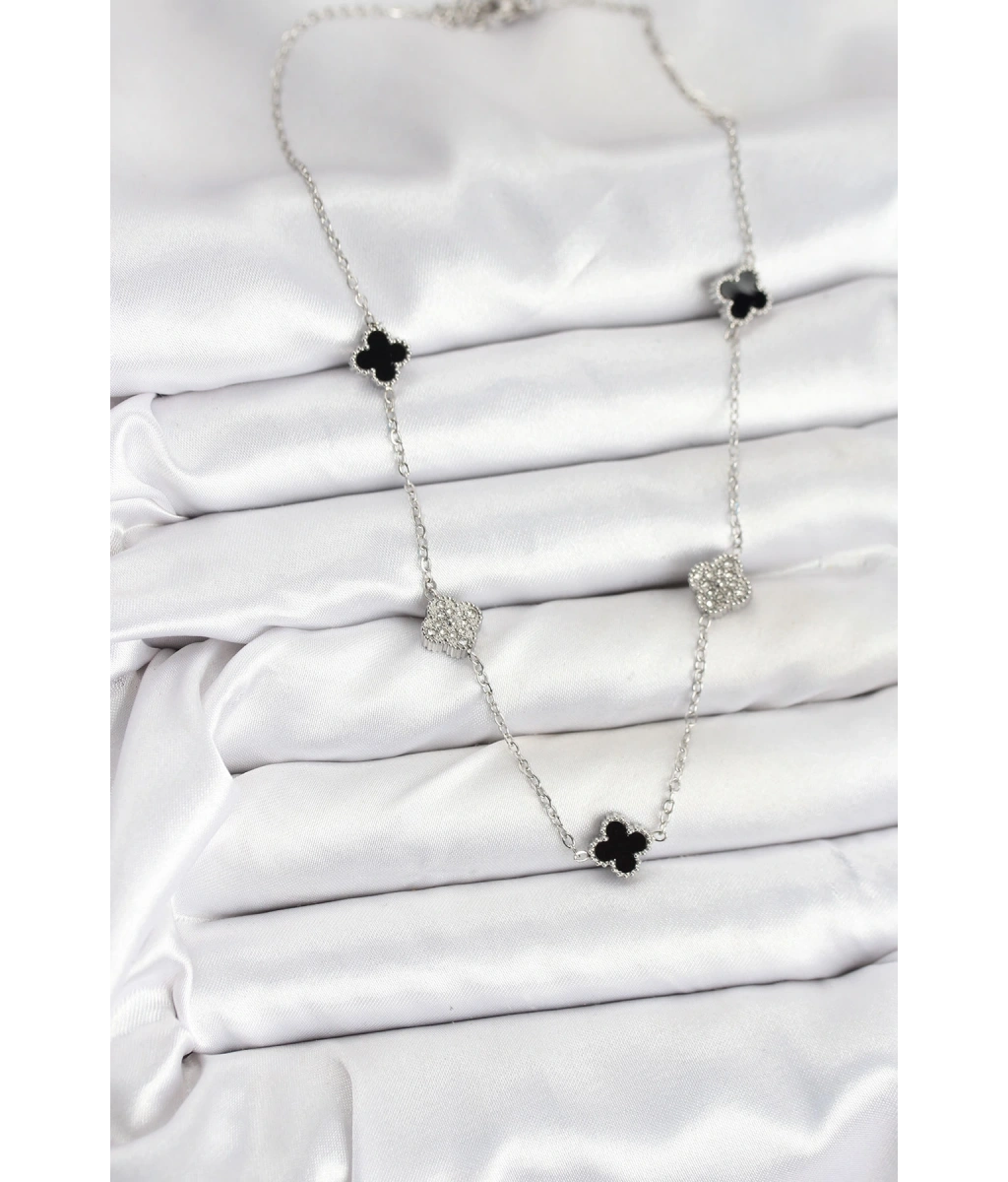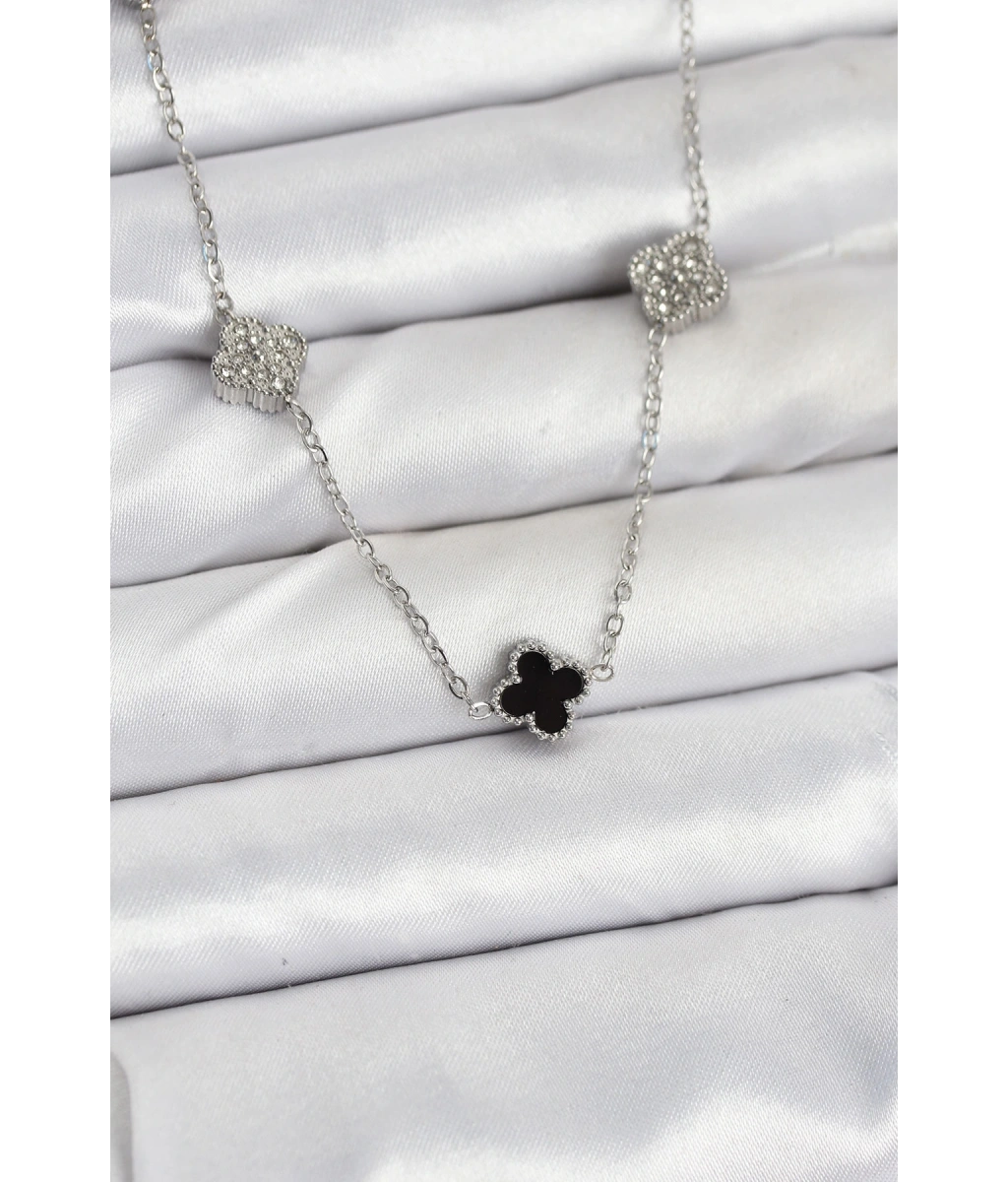Shoecide 316l Çelik Zincir Gümüş Renk Siyah Ve Zirkon Taşlı Baby Boy Yonca Kadın Kolye