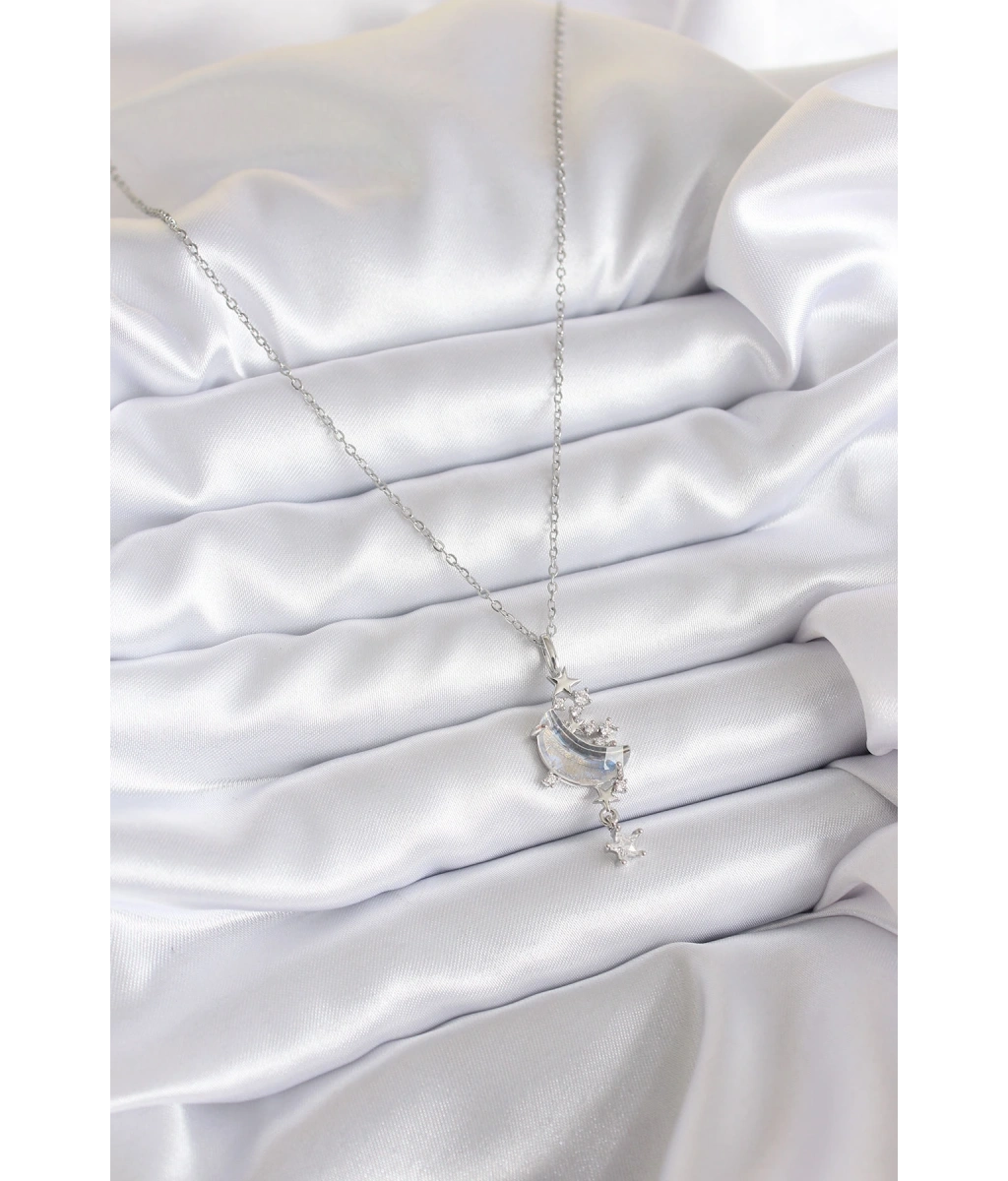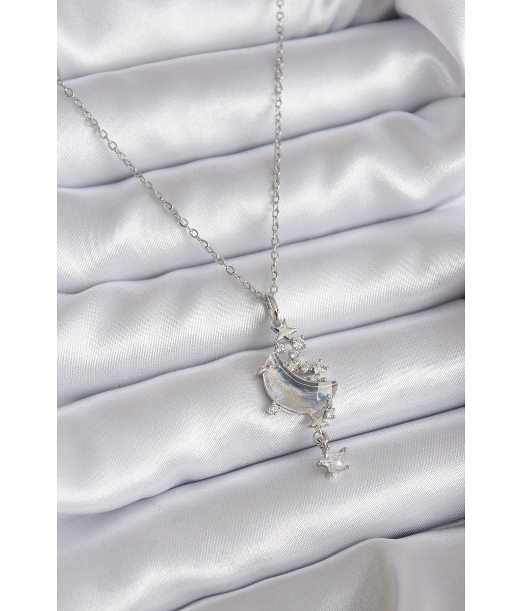 Shoecide 316l Çelik Zincir Gümüş Renk Zirkon Taşlı Ay Model Sallantı Yıldız Detay Kadın Kolye
