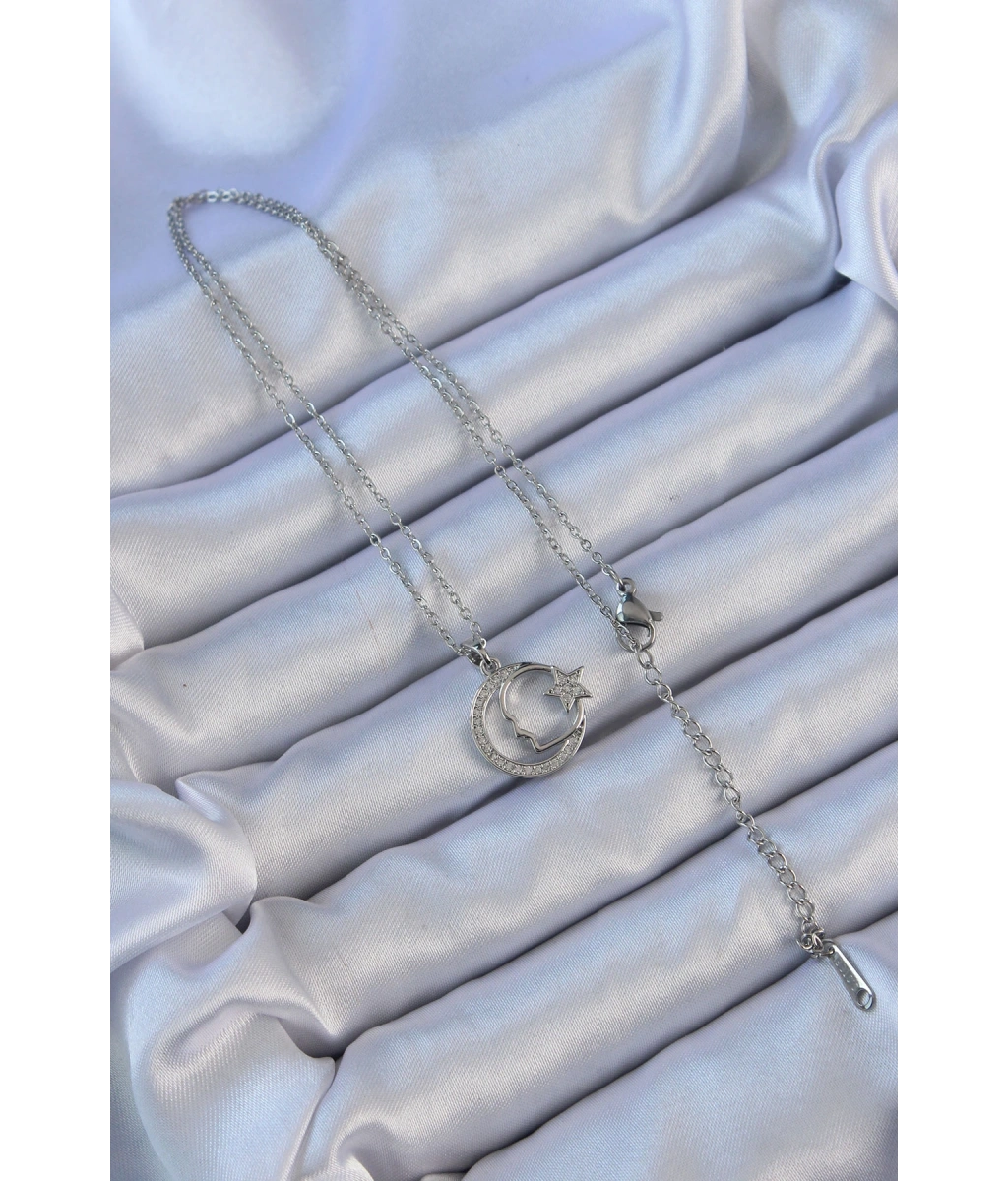 Shoecide 316l Çelik Zincir Gümüş Renk Ay Yıldız Model Zirkon Taşlı Kadın Kolye
