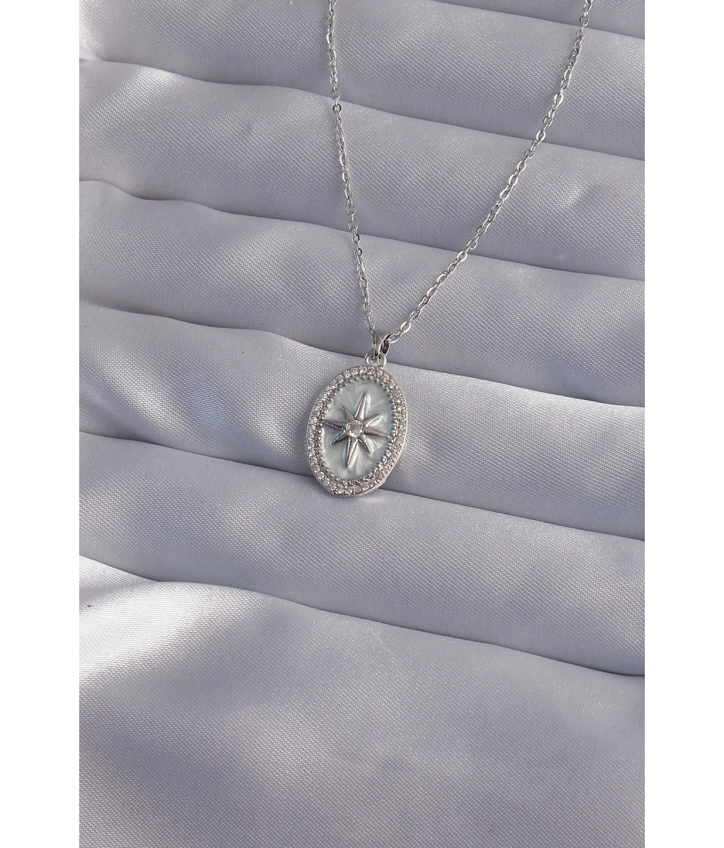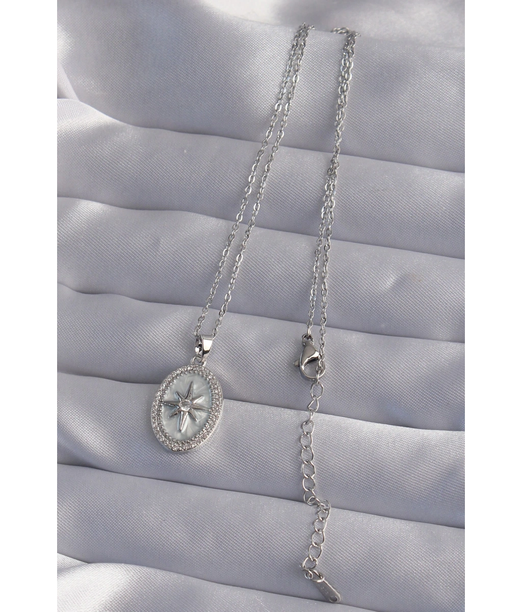 Shoecide 316l Çelik Zincir Gümüş Renk Zirkon Taşlı Kabartmalı Kutup Yıldızı Kolye
