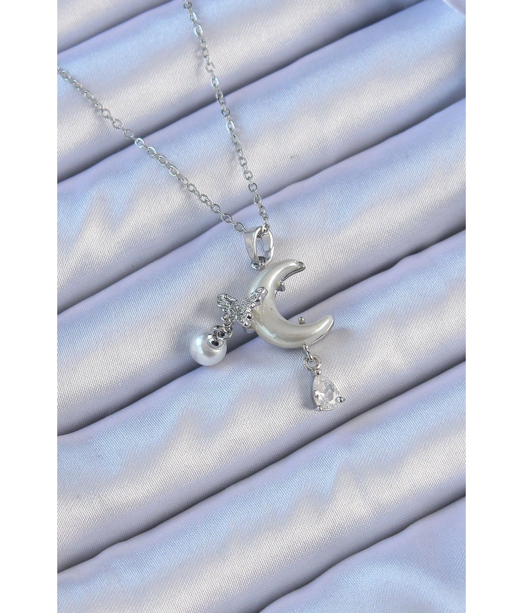 Shoecide 316l Çelik Zincir Gümüş Renk Zirkon Taşlı Kelebekli Mineli Ay Kolye
