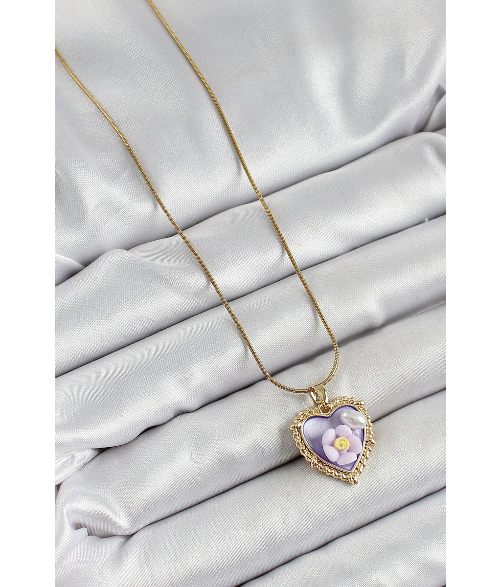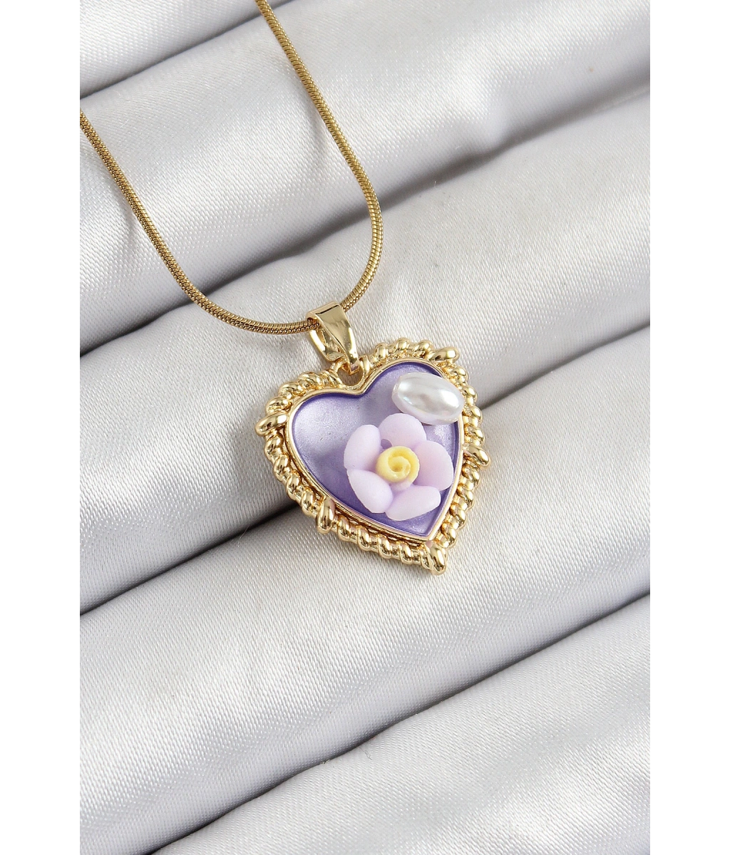 Shoecide 316l Çelik Zincir Mor Sanatsal Portre İnci Detaylı Papatya Figürlü Kalp Model Gold Renk Kadın Kolye