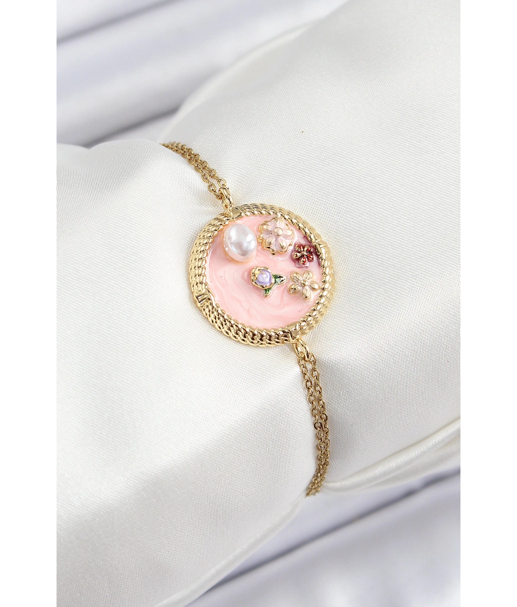 Shoecide 316l Çelik Zincir Pembe Mineli Sanatsal Portre İnci Detaylı Çiçek Model Gold Renk Kadın Bileklik