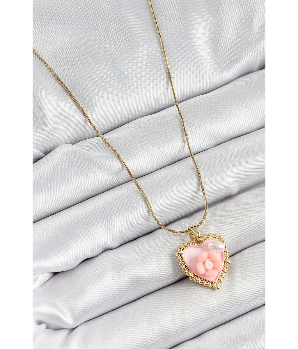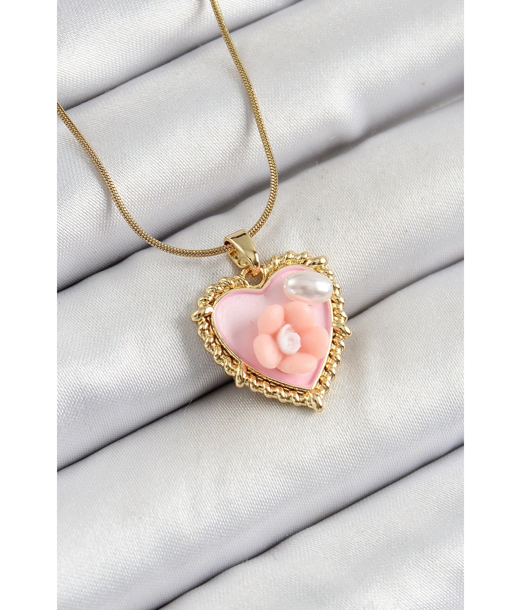 Shoecide 316l Çelik Zincir Pembe Sanatsal Portre İnci Detaylı Papatya Figürlü Kalp Model Gold Renk Kadın Kolye
