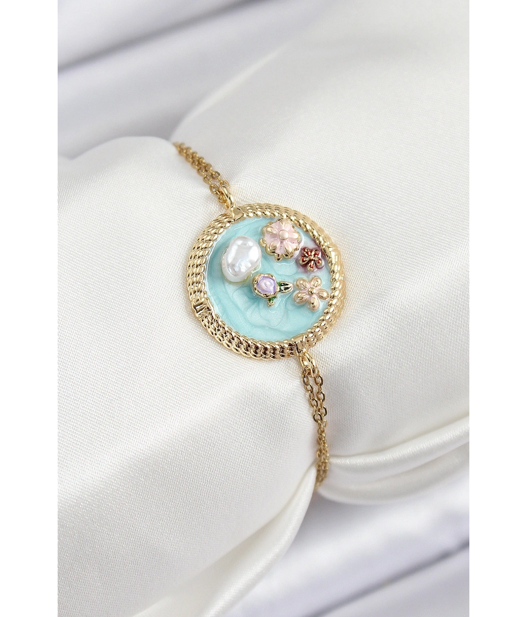 Shoecide 316l Çelik Zincir Turkuaz Mineli Sanatsal Portre İnci Detaylı Çiçek Model Gold Renk Kadın Bileklik