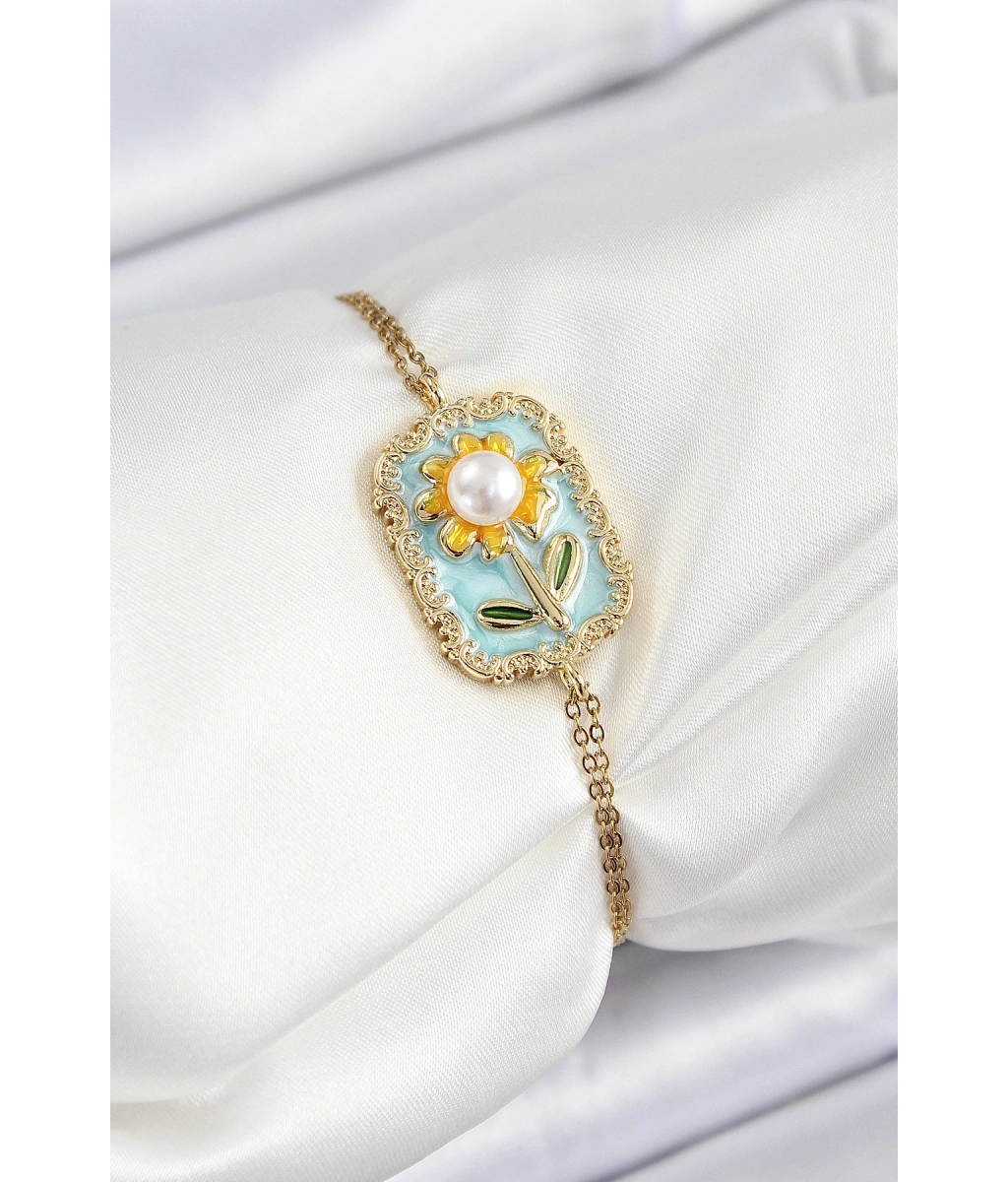 Shoecide 316l Çelik Zincir Turkuaz Mineli Sanatsal Portre İnci Detaylı Papatya Model Gold Renk Kadın Bileklik